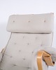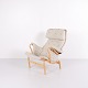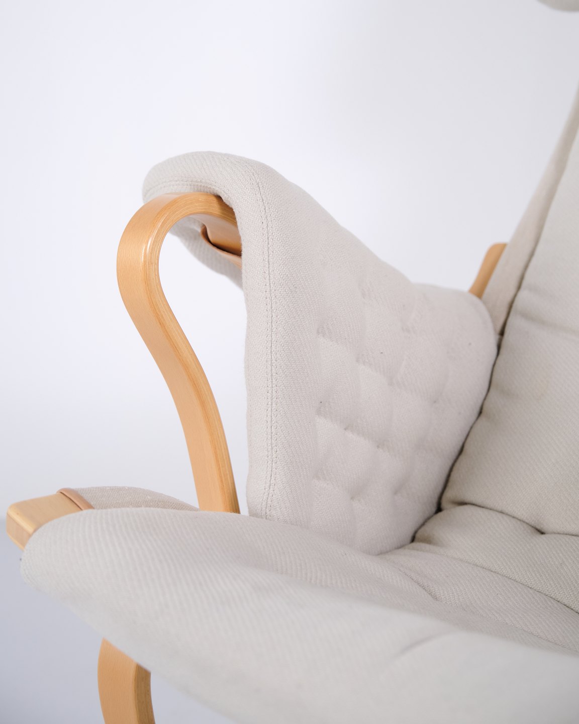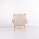 Fauteuil Pernilla avec repose-pieds assorti, modèle 69, conçu par Bruno Mathsson et fabriqué par DUX en édition 35e anniversaire. Le fauteuil est réalisé en bois de hêtre avec un revêtement en tissu clair et présente un design ergonomique caractéristique qui suit les courbes naturelles du corps et assure un grand confort.