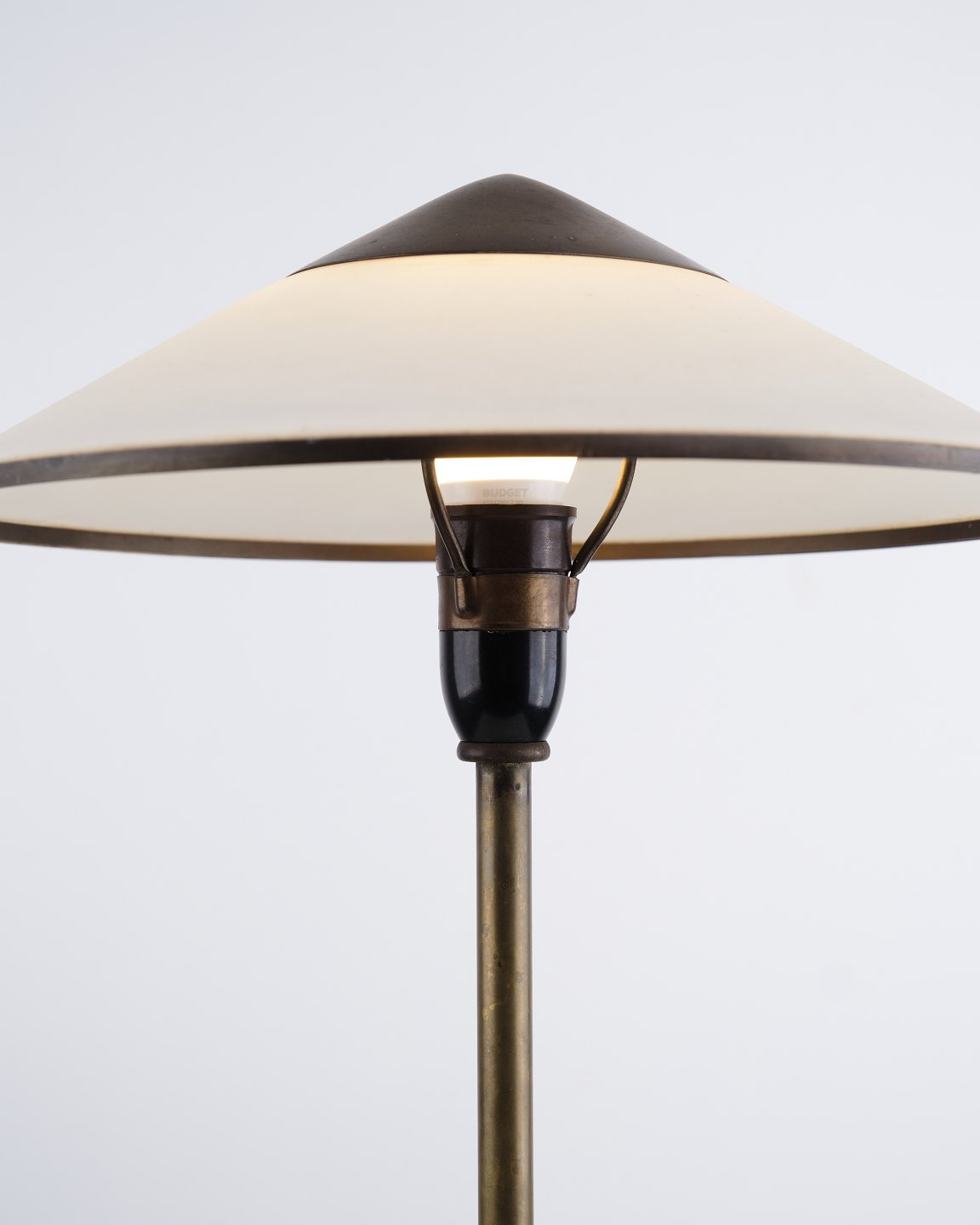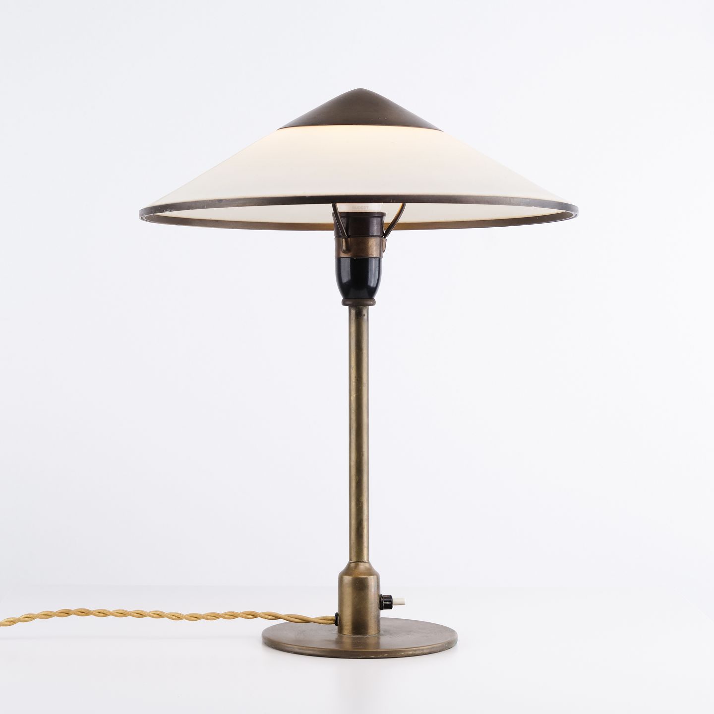 Lampe de table Niels Thykier Kongelys en laiton avec abat-jour blanc cassé. Design danois classique avec une lumière élégante et fonctionnelle.