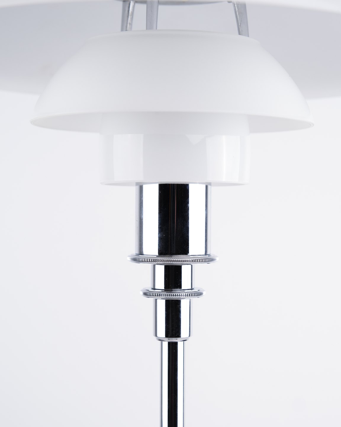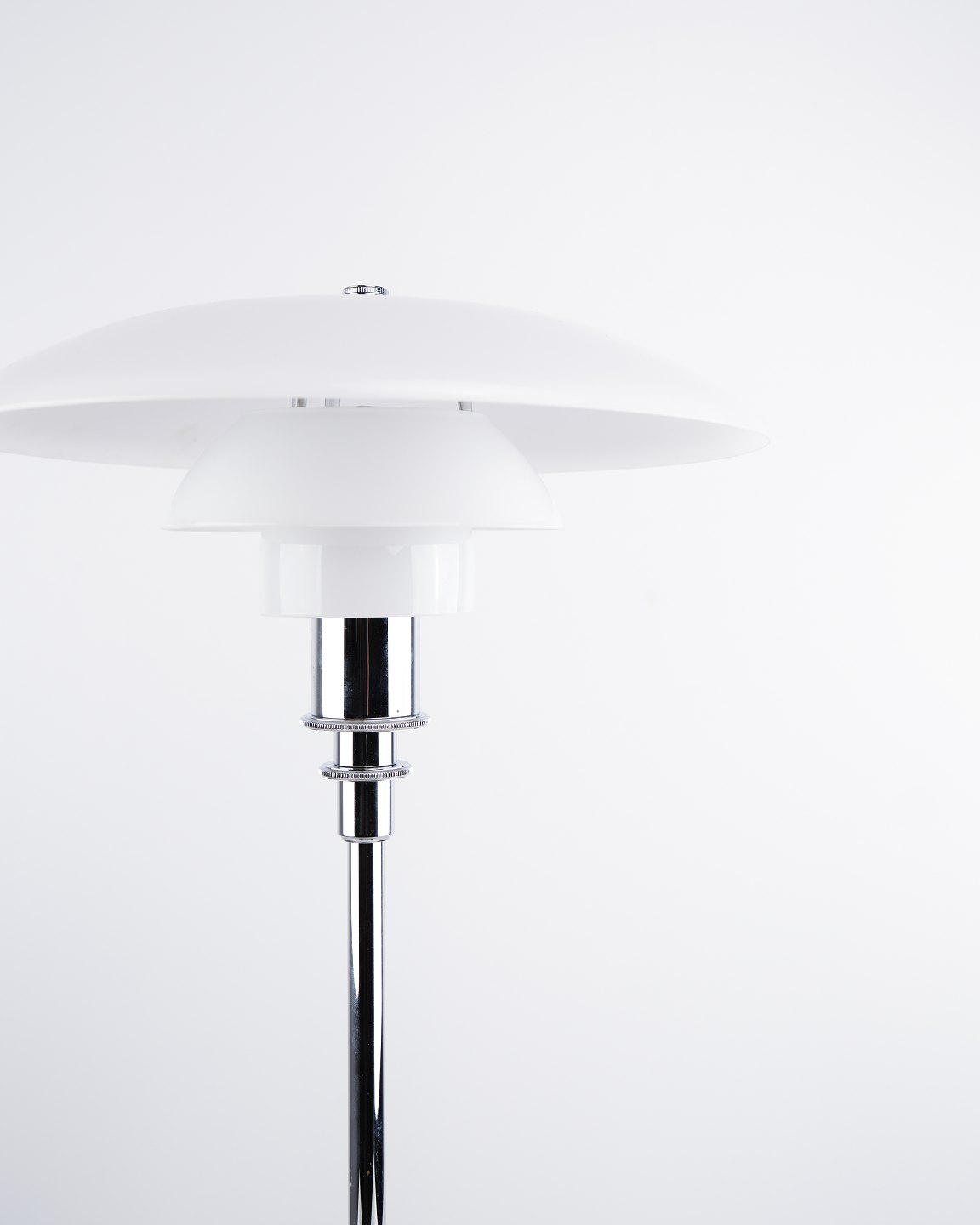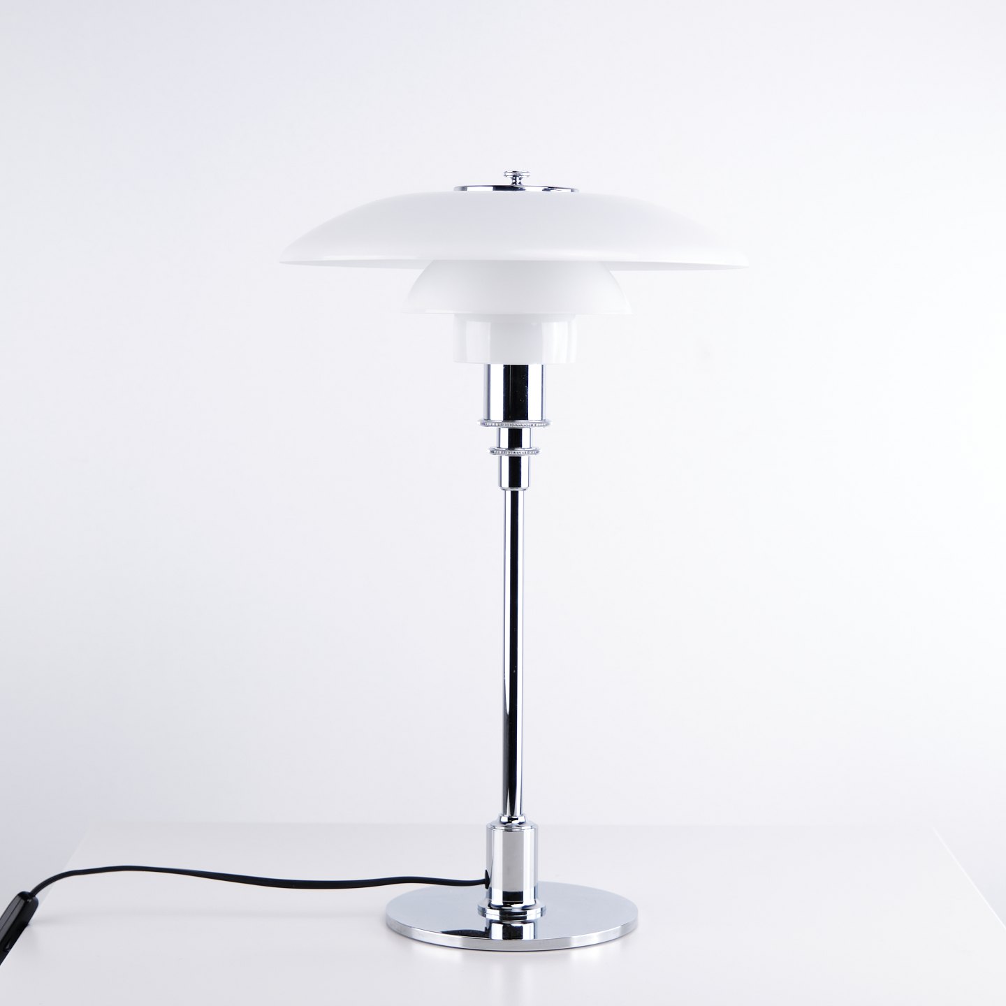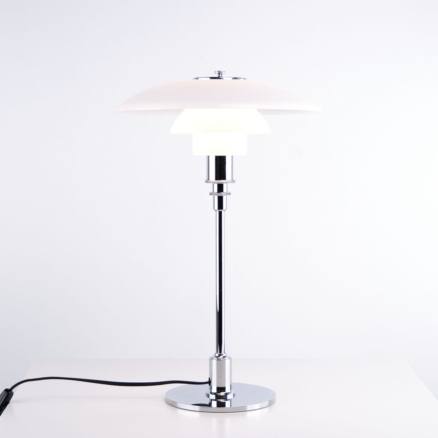 Lampe de table PH 3/2 conçue par Poul Henningsen et fabriquée par Louis Poulsen. La lampe est réalisée avec des abat-jours en verre opalin blanc, assurant une lumière douce et sans éblouissement. Le système iconique à trois abat-jours est développé pour une répartition optimale de la lumière et constitue un élément central de la philosophie de design de Henningsen.