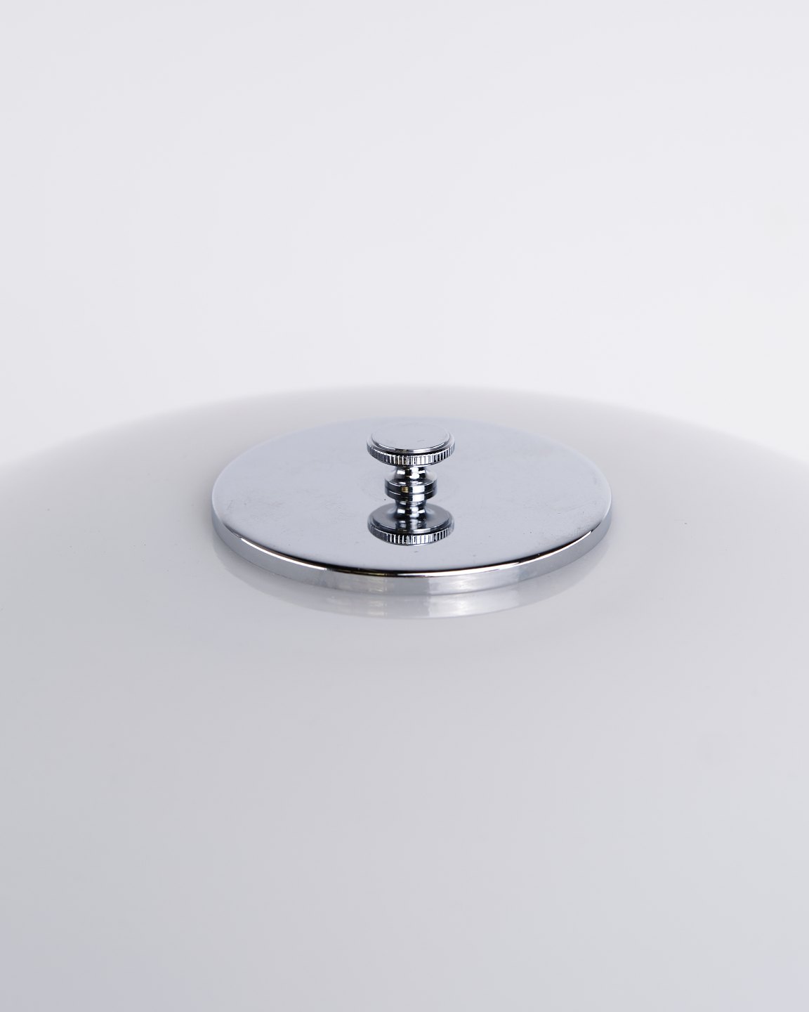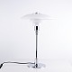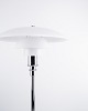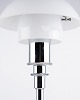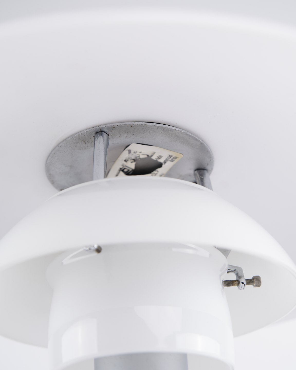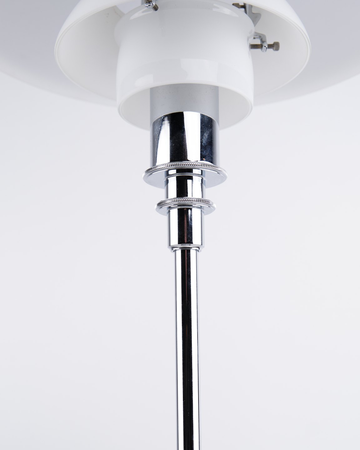 Lampe de table PH 3/2 conçue par Poul Henningsen et fabriquée par Louis Poulsen. La lampe est réalisée avec des abat-jours en verre opalin blanc, assurant une lumière douce et sans éblouissement. Le système iconique à trois abat-jours est développé pour une répartition optimale de la lumière et constitue un élément central de la philosophie de design de Henningsen.