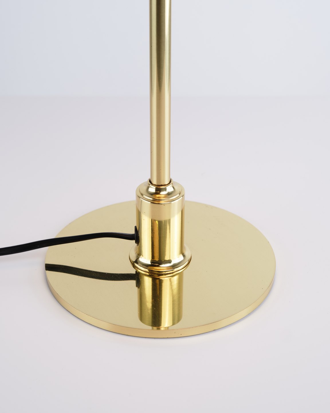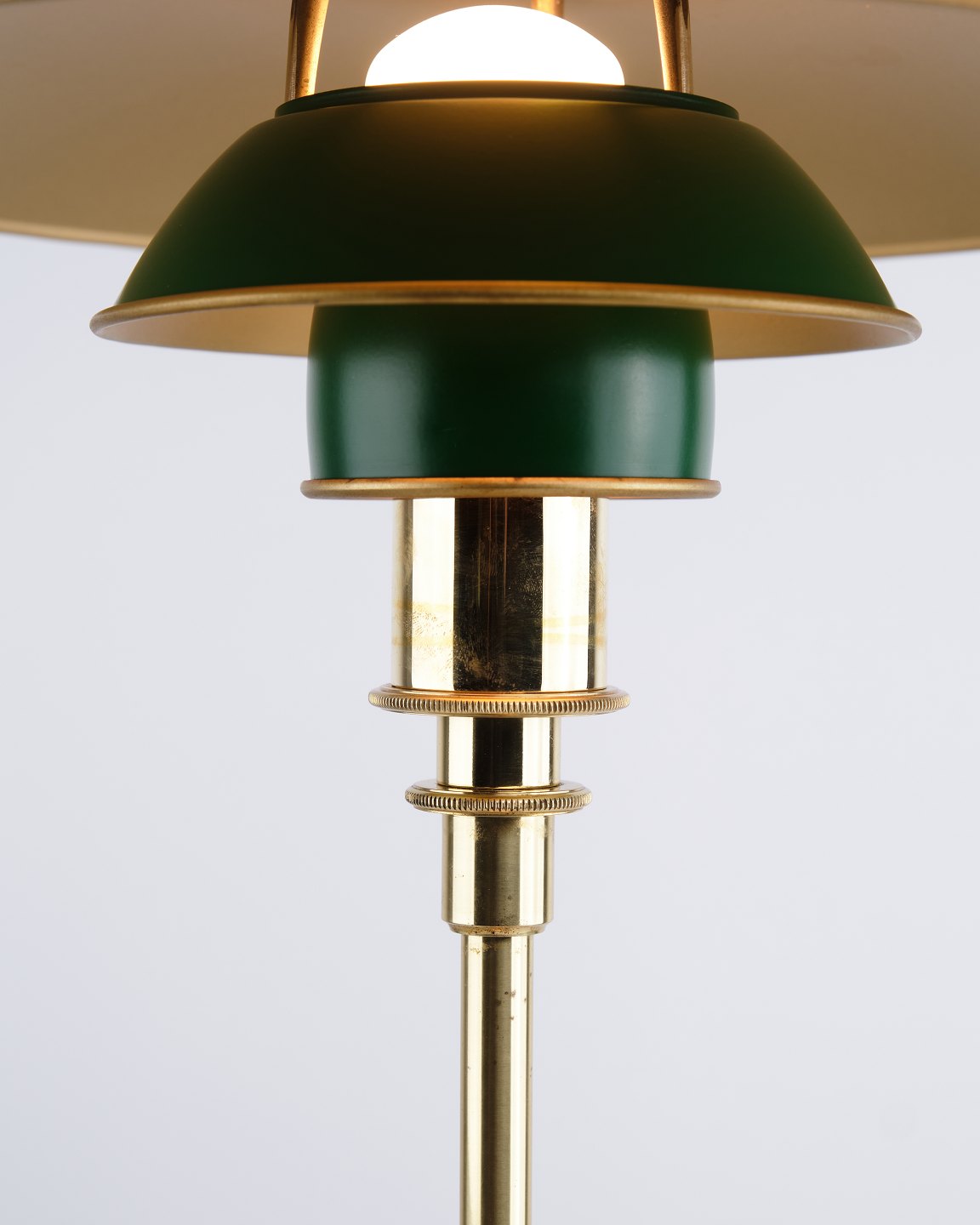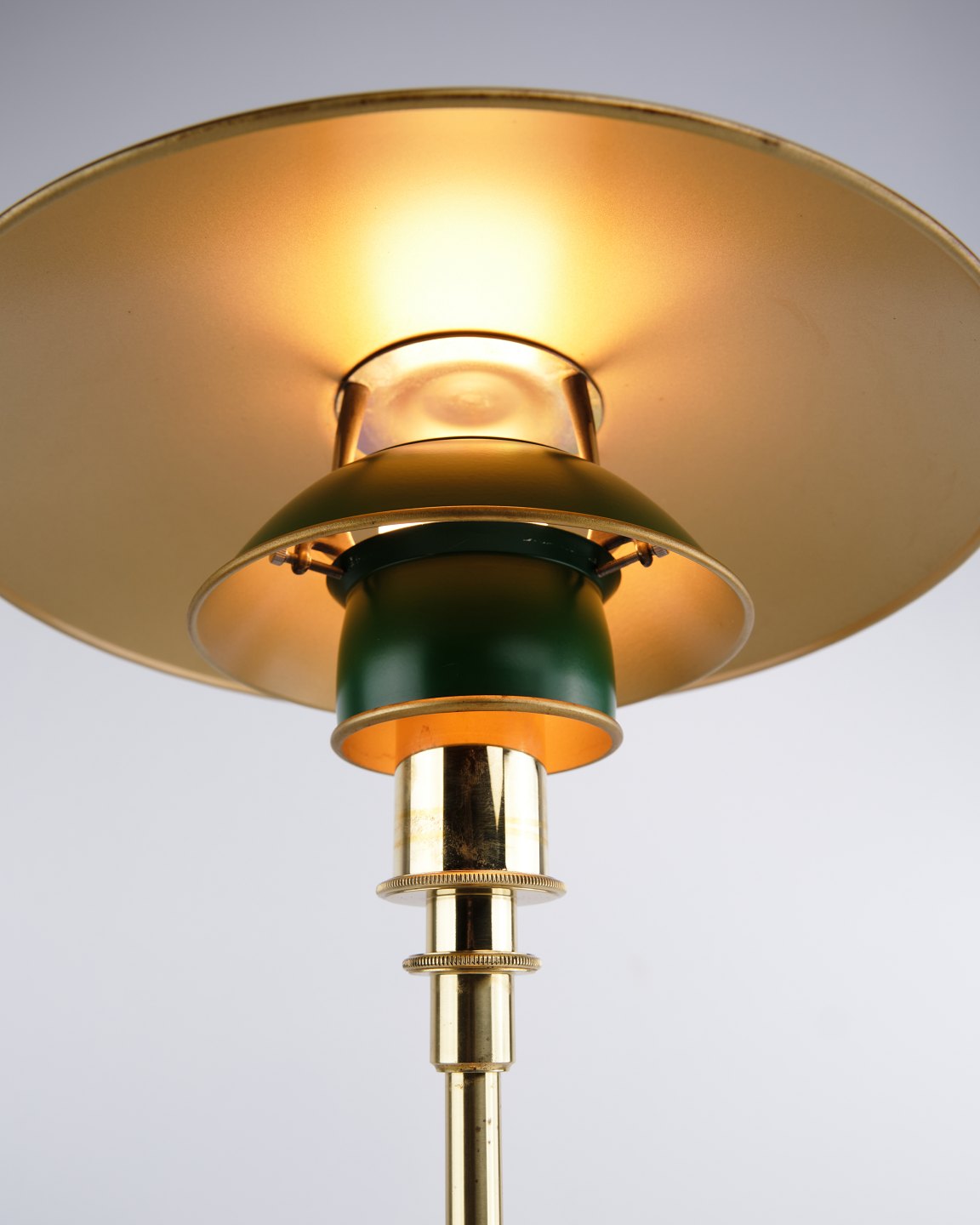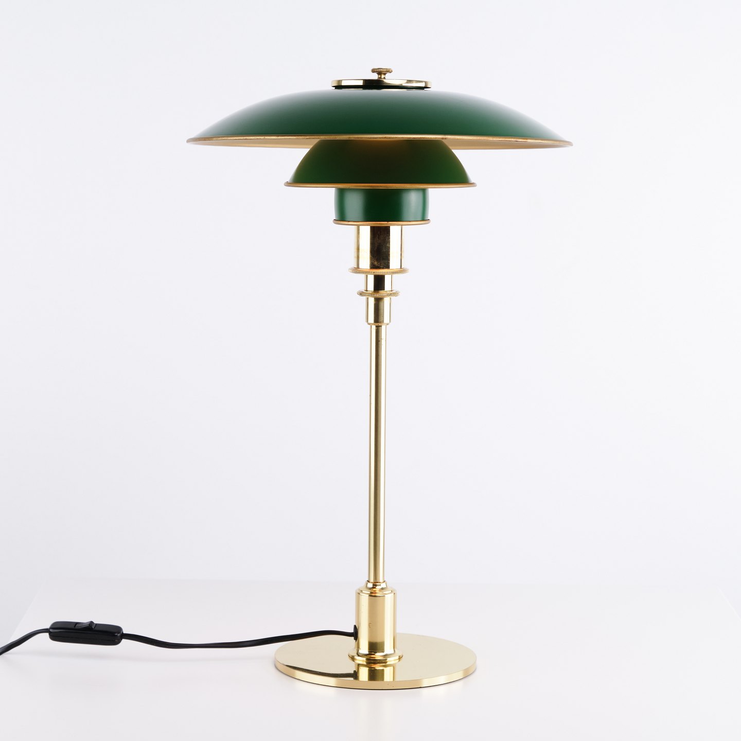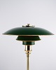 Lampe de table PH 3/2 conçue par Poul Henningsen et éditée en édition anniversaire en 1996 par Louis Poulsen. La lampe est réalisée en laiton avec des abat-jours métalliques verts, offrant une expression marquée et classique. Le modèle a été produit pendant une période limitée et existe également en version avec abat-jours métalliques rouges.
