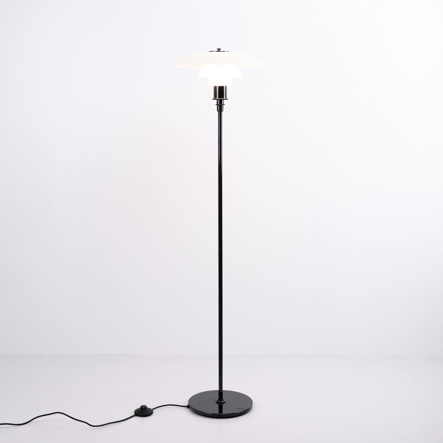 Lampadaire PH 3,5/2,5 conçu par Poul Henningsen et fabriqué par Louis Poulsen. La lampe est réalisée avec une structure noire et des abat-jours en verre opalin blanc, offrant une expression élégante et équilibrée. Le système iconique à trois abat-jours assure une lumière douce sans éblouissement et une répartition uniforme de la lumière.