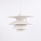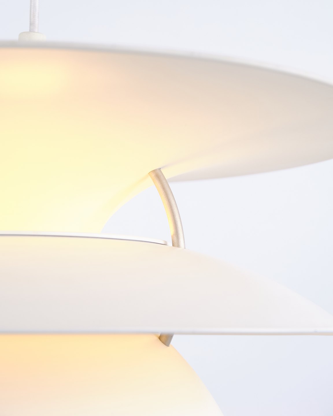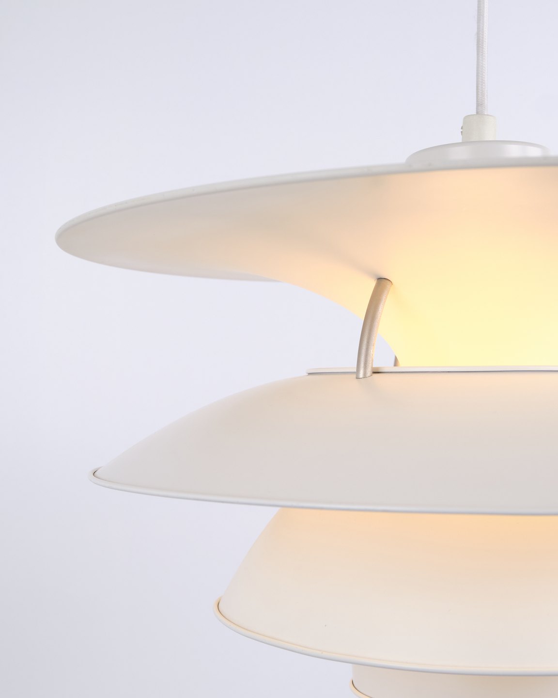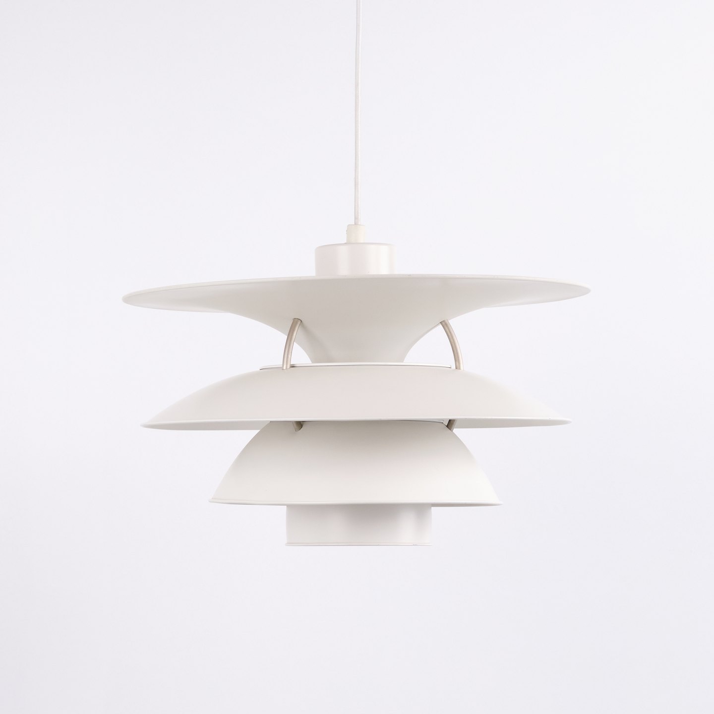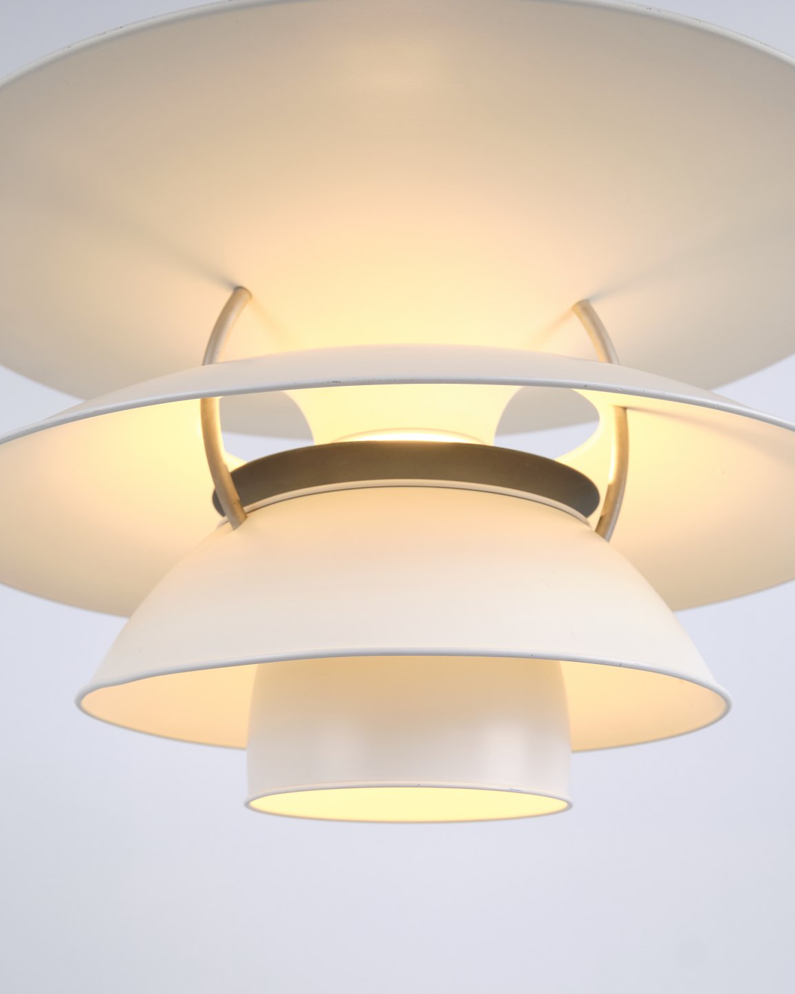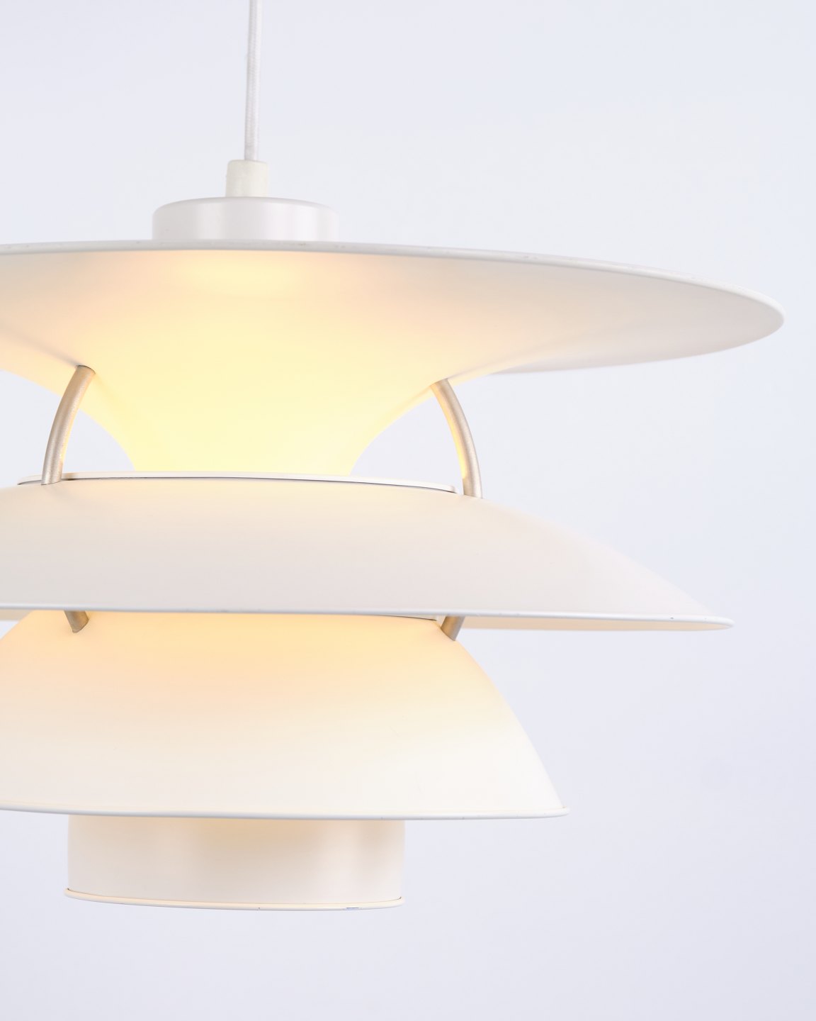 Suspension Charlottenborg, modèle PH 5-4½, conçue par Poul Henningsen et fabriquée par Louis Poulsen dans les années 1980. La lampe est basée sur le système à 4 abat-jours introduit en 1931 dans le but d’augmenter le rendement lumineux et de créer un éclairage plus efficace dans l’espace. La construction diffuse une plus grande quantité de lumière horizontalement, offrant un meilleur éclairage des murs et de l’environnement par rapport aux lampes traditionnelles à 3 abat-jours.
