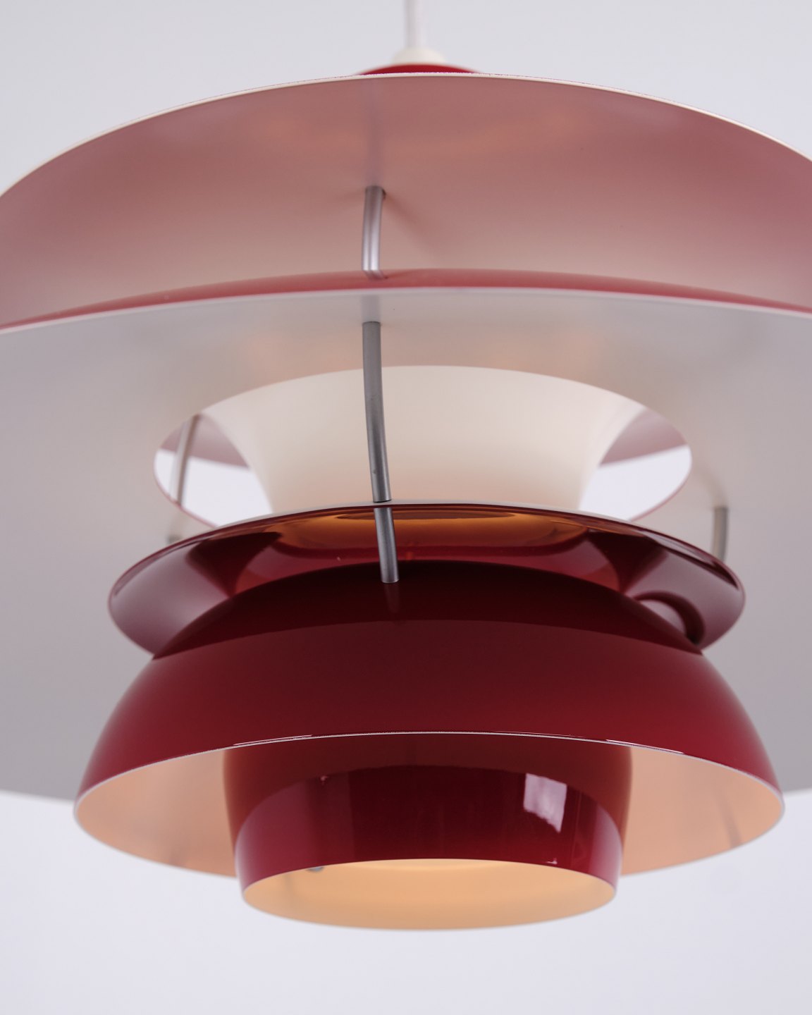 Suspension PH 5 en métal laqué rouge de Louis Poulsen conçue par Poul Henningsen. Lampe danoise classique avec une lumière fonctionnelle et sans éblouissement.