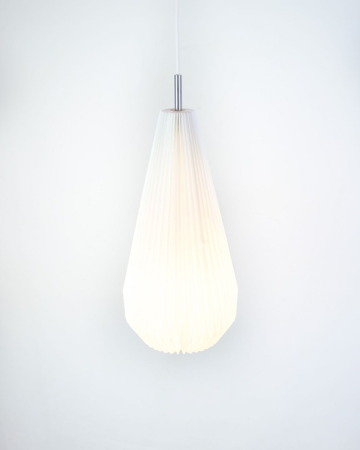 Sculptural pendant lamp from Le Klint, model 181 "Komet", designed by Poul Christiansen in 2003. The hand-folded shade in white plastic forms a teardrop-shaped silhouette, which spreads a soft, pleasant light without glare.