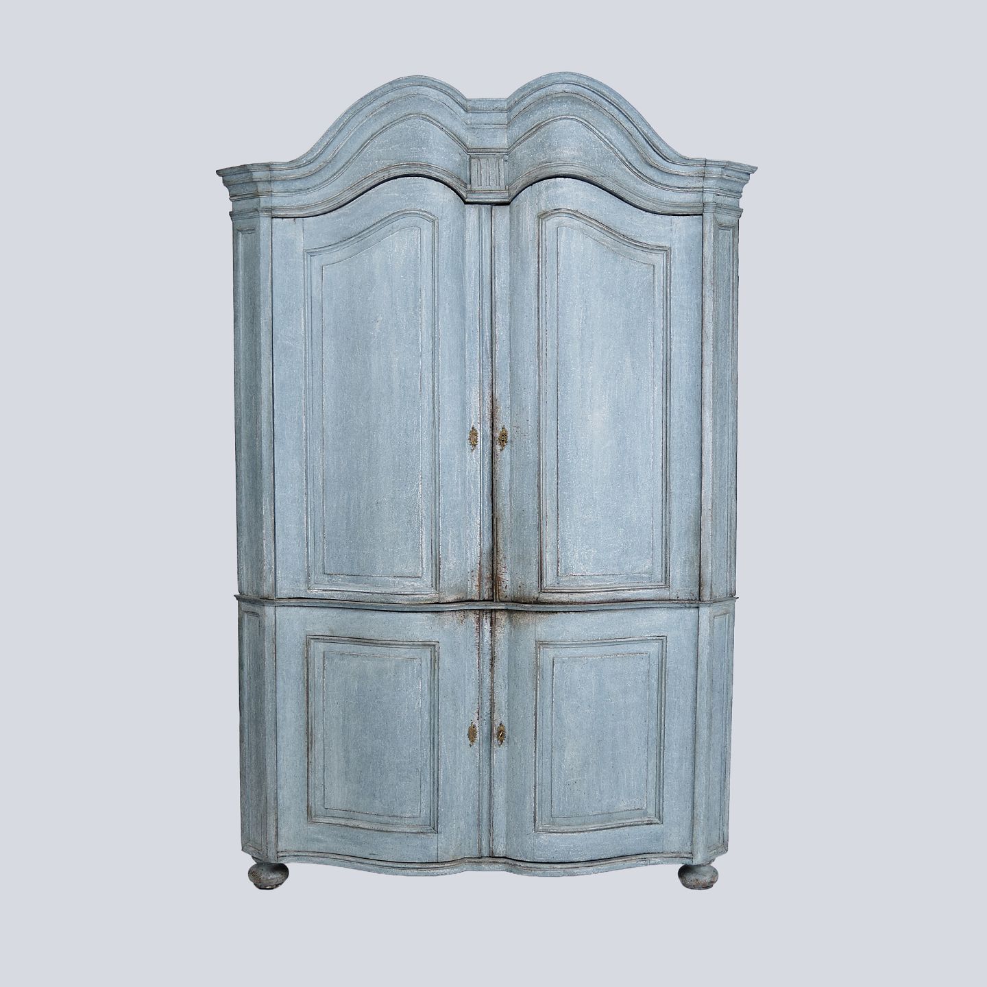 Large baroque corner cabinet from the 1780s. Original blue paint, curved doors and brass fittings. Rare and authentic antique furniture.