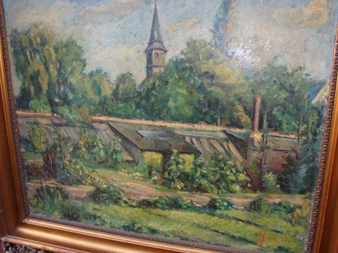 Painting with church tower in the background signed Ejner Johansen from 1919.