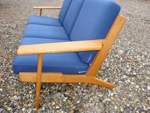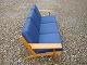 SoldSofa 3 seater in light oak designed by Hans Wegner with blue wool fabric made from Getama furniture factory in good condition 5000 showroom