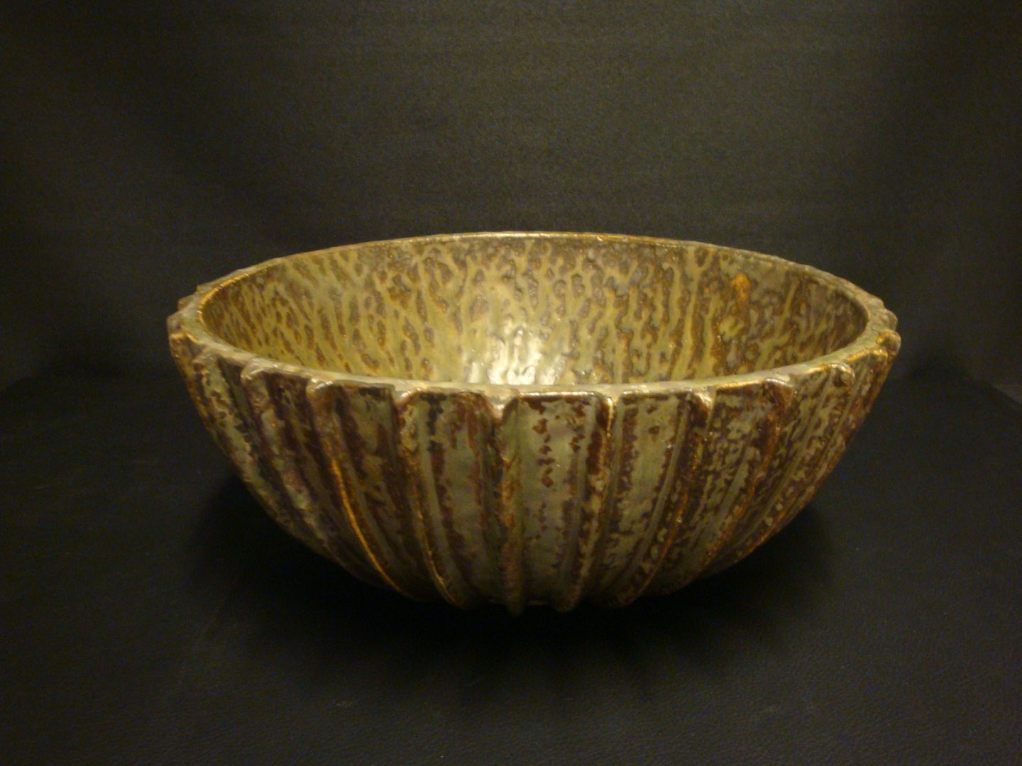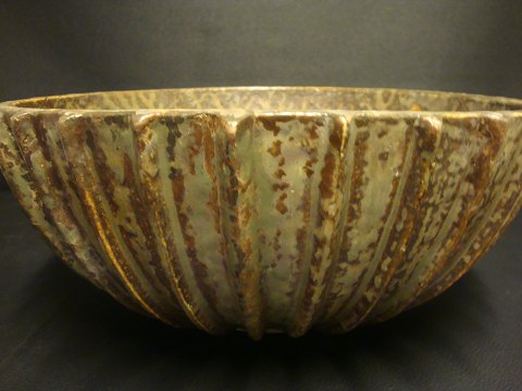 SoldArne Bang bowl made of glazed stoneware with vertical fluting. Ø26cm and Height 11cm. In perfect condition.