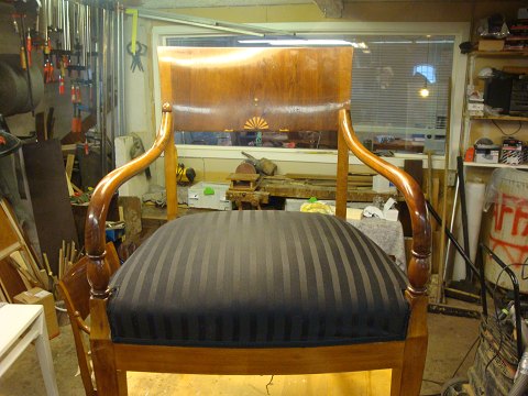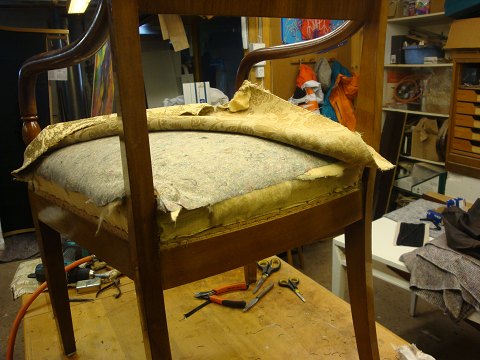 Her et eksempel på en stol der er blevet frisket op med en ny polstring. Se før og efter foto.