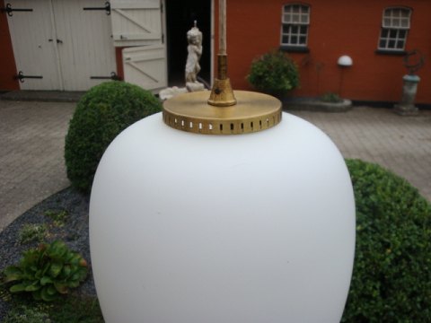 SolgtKinapendel af Bent Karlby. Opalglas og med messing i bund & top. Måler 39 cm i højden og Ø98.5cm