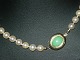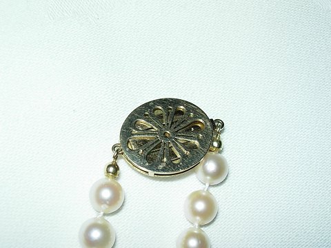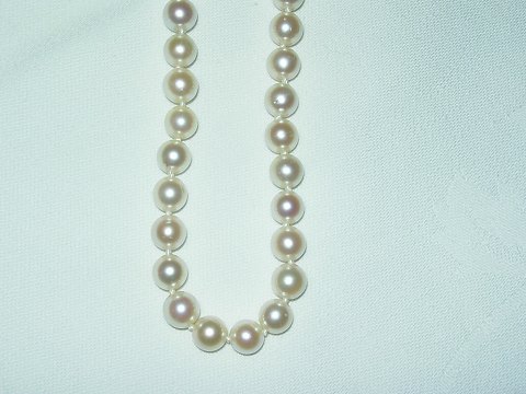 Culturepearlnecklace wiht pretty colour and old handmade 14 ct loch with chrysopres stone.Length 46 cm and the pearls dia is 7 mm.