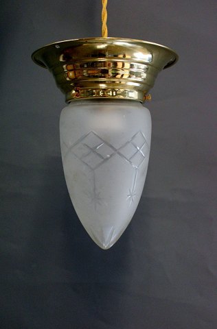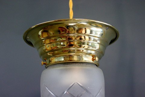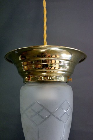 2 pendler i messing og i Jugendstil fra år 1930. Glasset er fra Fyns glasværk og pendlerne er blevet istandsat.