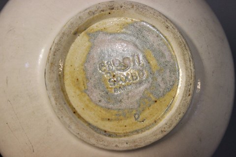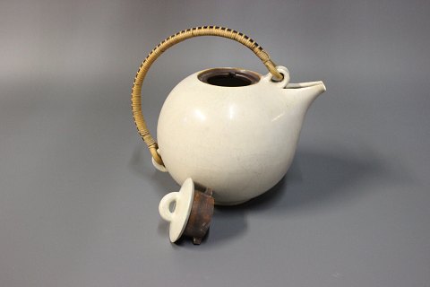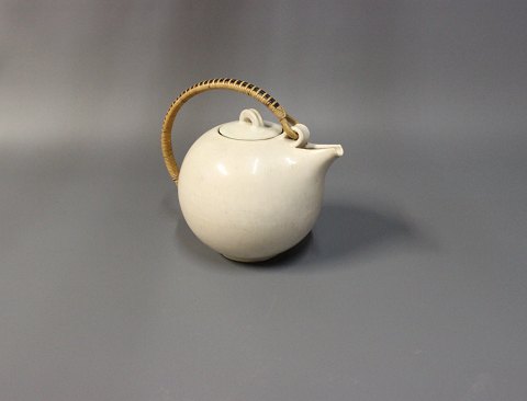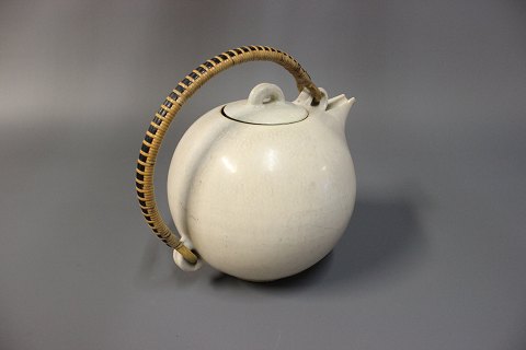 SoldWhite glazed stoneware teapot with bast handle from around the 1940s. The teapot is stamped Saxbo Denmark and with the no. 68, designed by Eva Stæhr Nielsen.