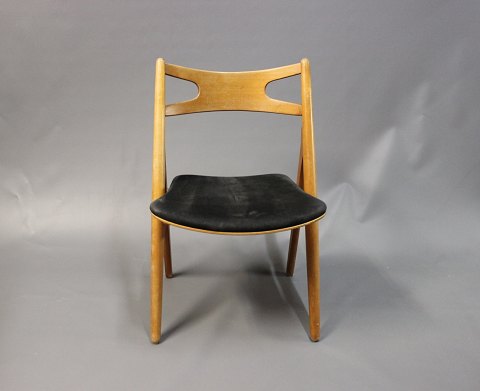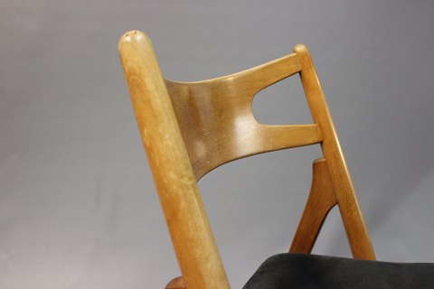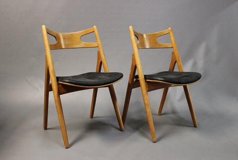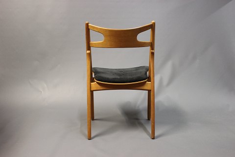 A pair of "Sawbench" dining room chairs in polished beech and suede, model CH29. The chairs were designed by Hans J. Wegner in 1952 and manufactured by Carl Hansen & Son.