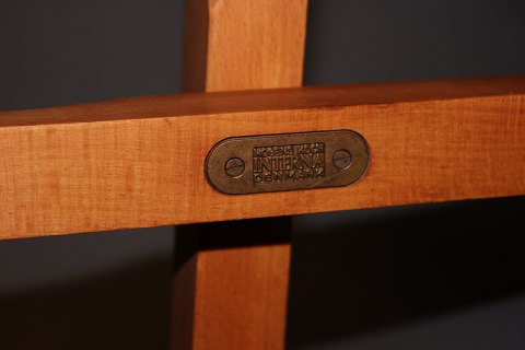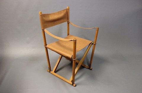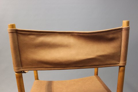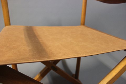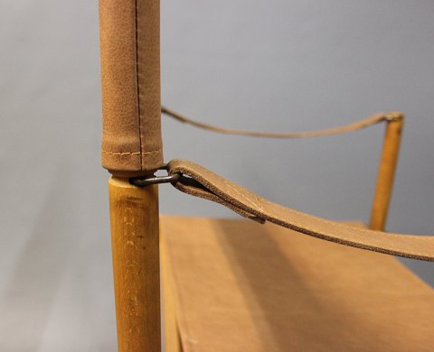 Three folding chairs, model MK99200, designed by Mogens Koch in 1932 and manufactured by Interna Denmark in the 1960s. The chairs are in polished beech, with brass rings and patinated leather seats.