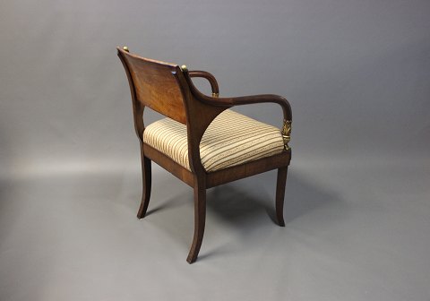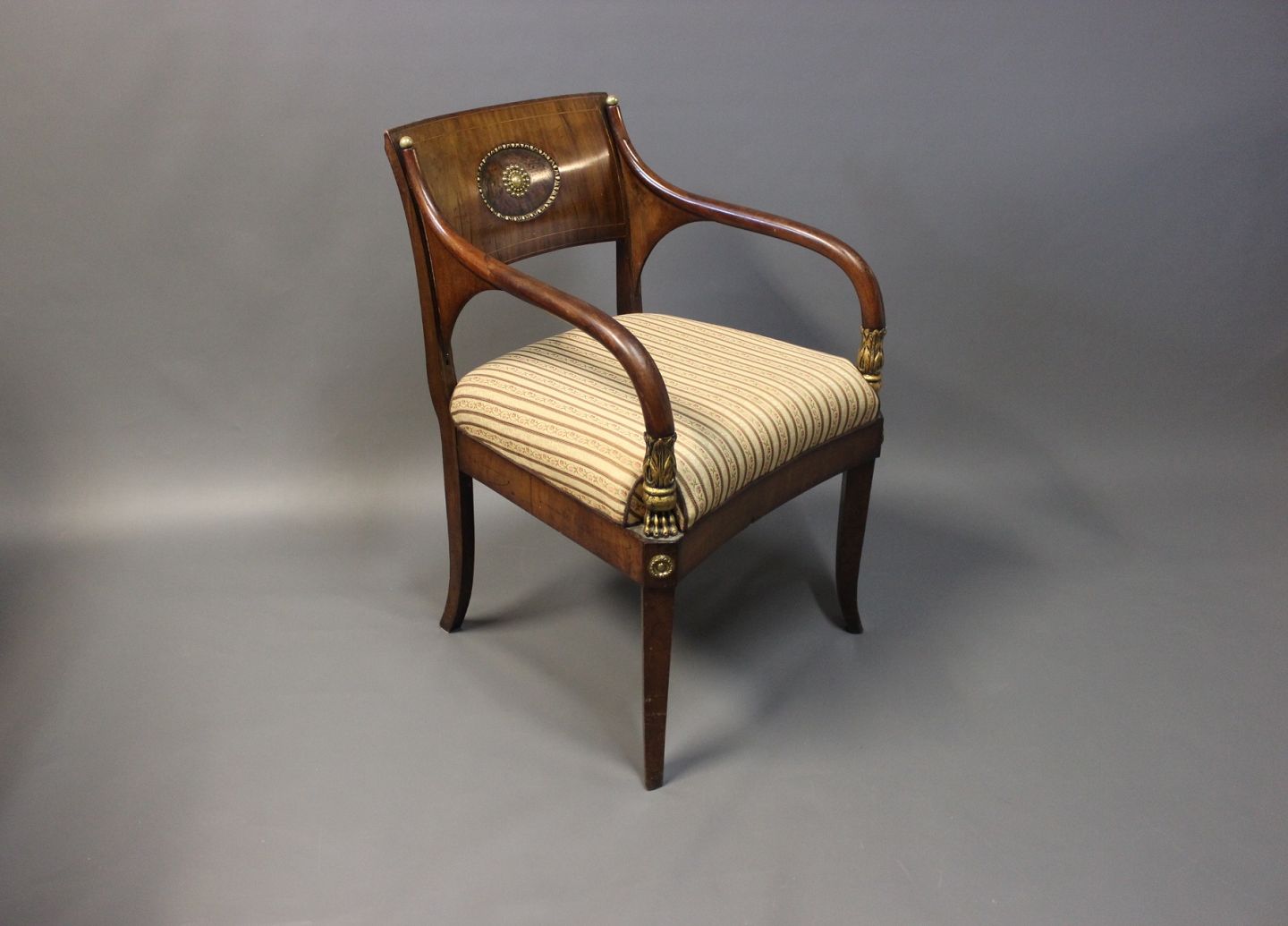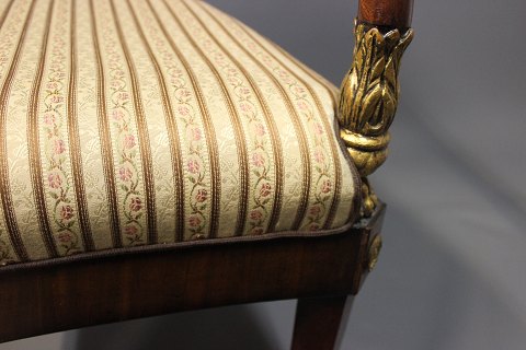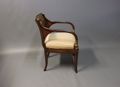 SoldArmchair in polished mahogany, inlaid fruitwood and decorated with brass and leaf gold. The chair was made in Germany in 1830 and upholstered in light fabric.