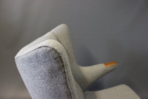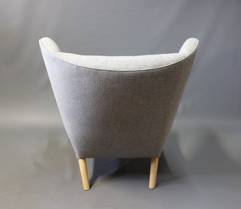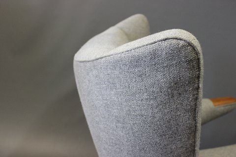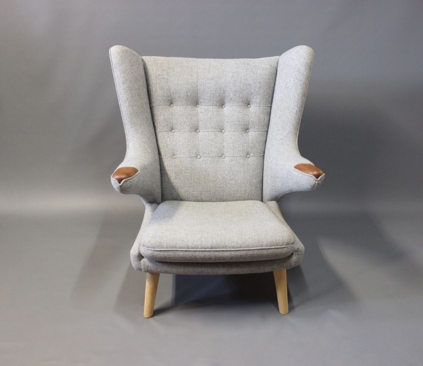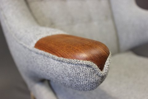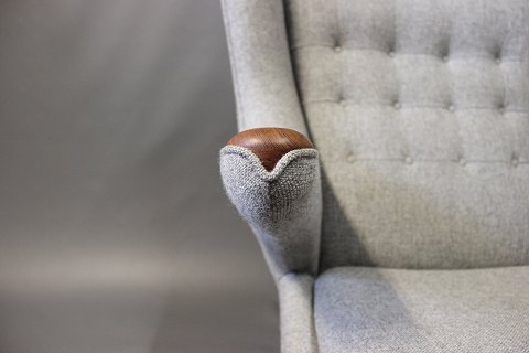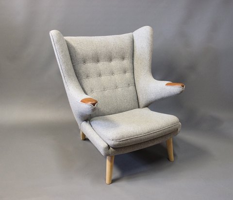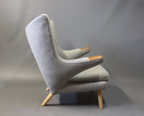 Papa Bear chair, model AP 19, designed by Hans J. Wegner in 1951 and manufactured by A.P. Møbler in 1963. The chair is upholstered in light grey Hallingdal wool, legs of oak and paws of teak.