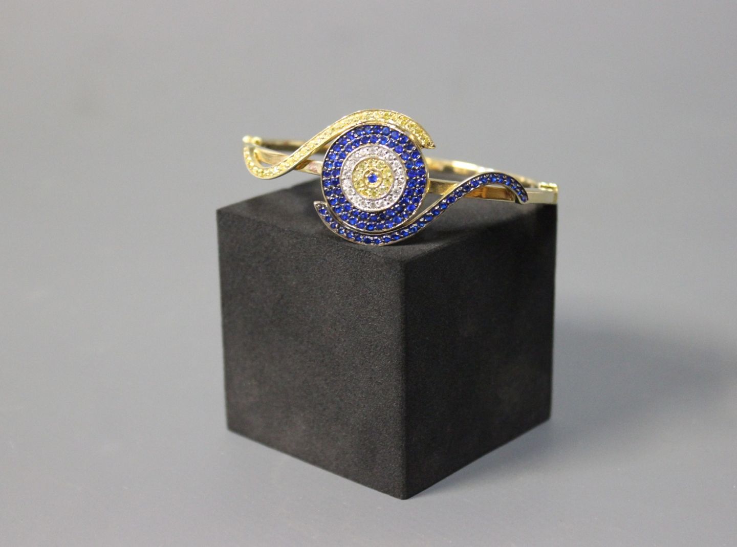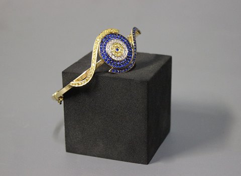 Armring i 14 kt. guld med zirkoner i forskellige farver.