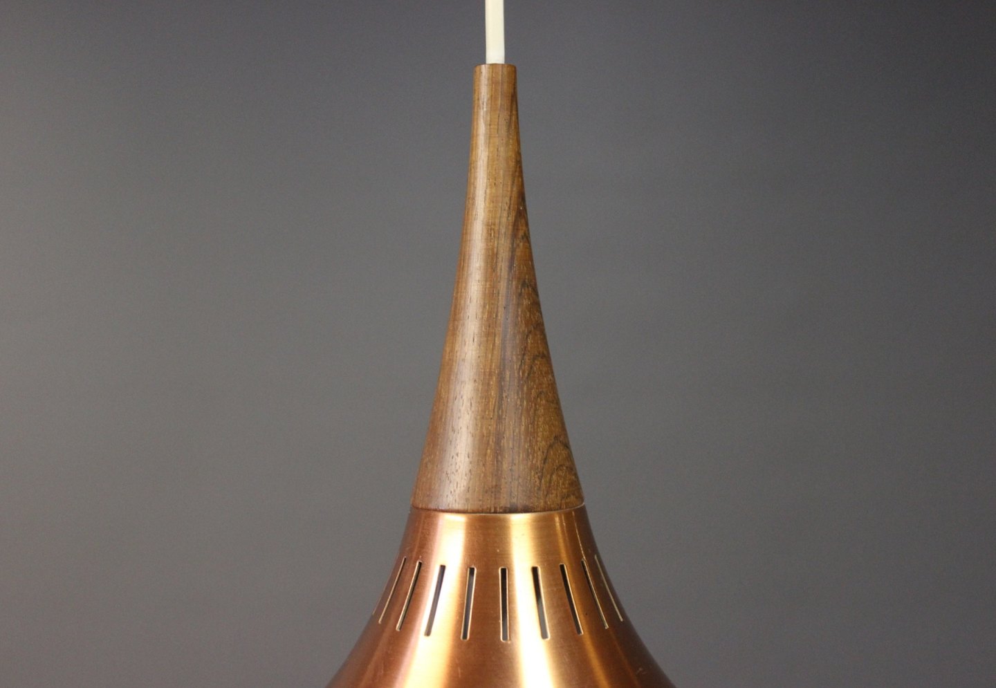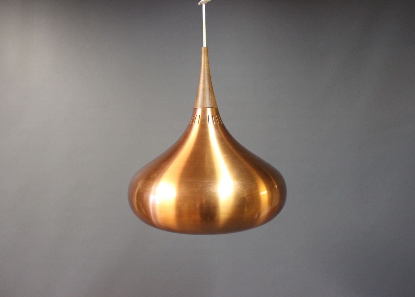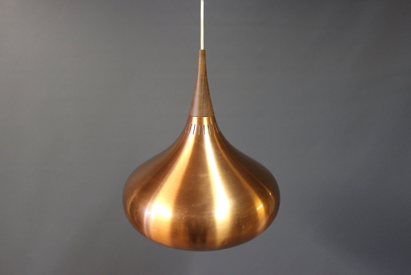 This "Orient" copper pendant, model P2, was designed by Jo Hammerborg for Fog & Mørup in Denmark in the 1960s. This lamp is in brushed copper and rosewood.