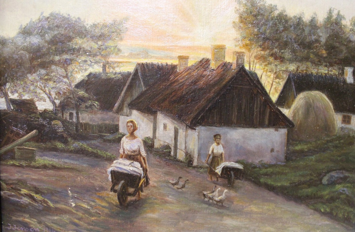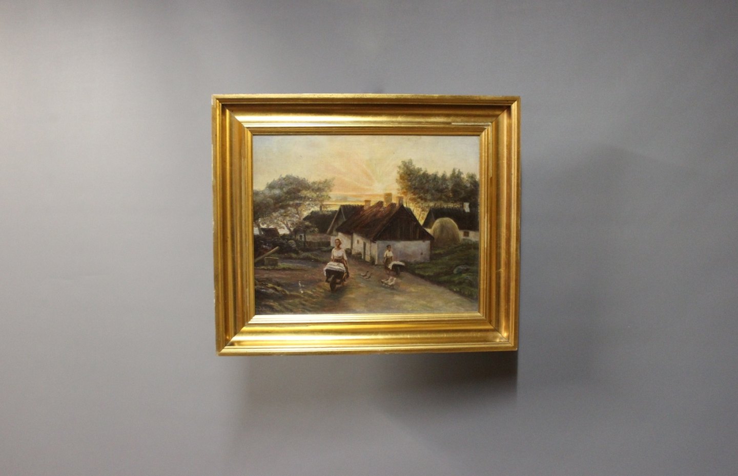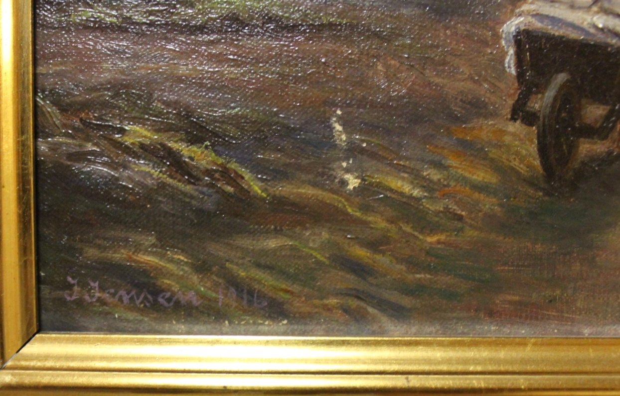 SoldOil painting of sunrise in the country signed J. Jensen 1916, with wooden frame decorated with goldleaf.