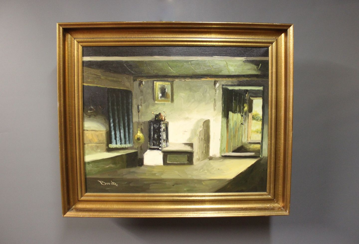 Oliemaleri af simpelt rum signeret Borch med træramme dekoreret med guldblad.