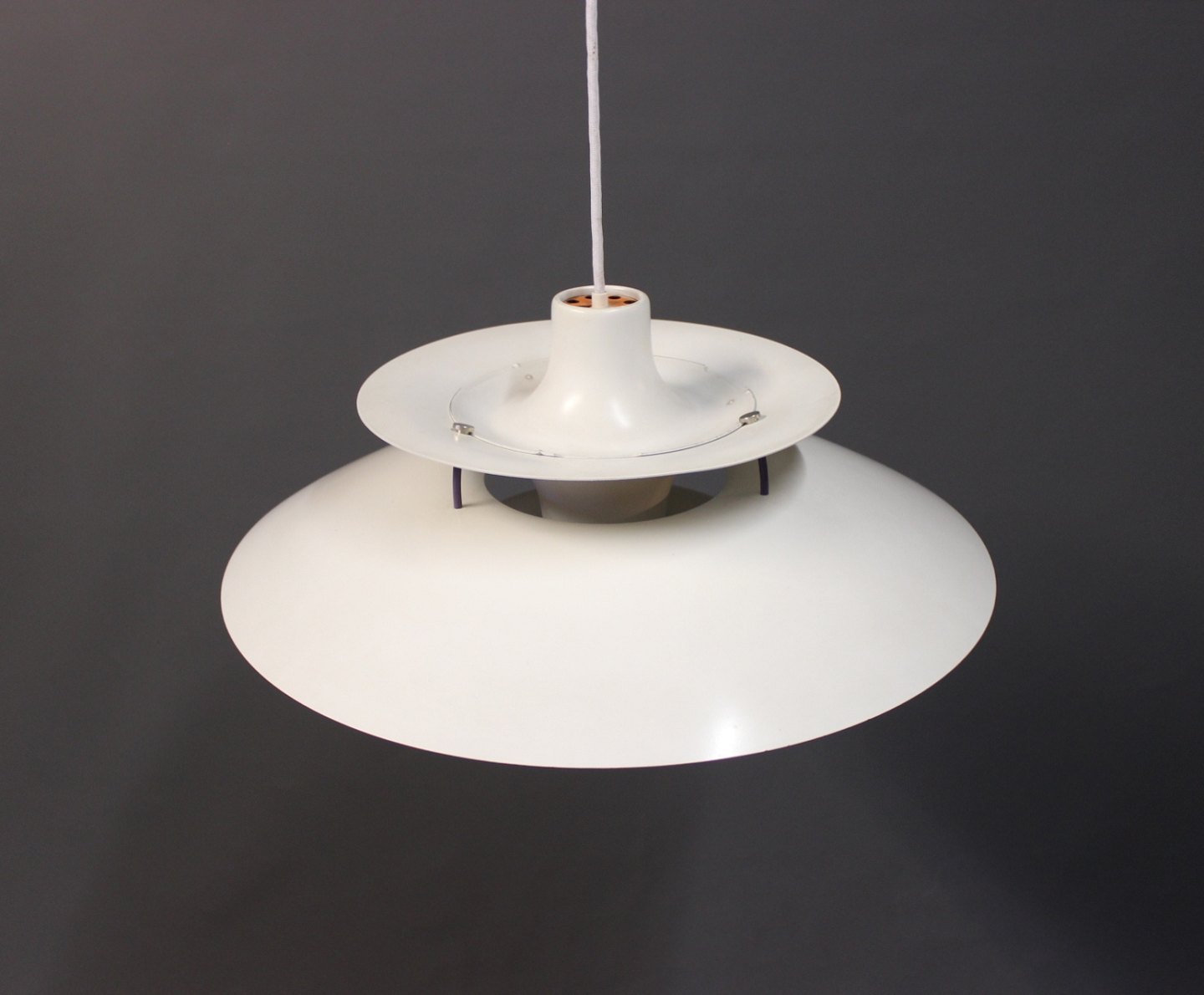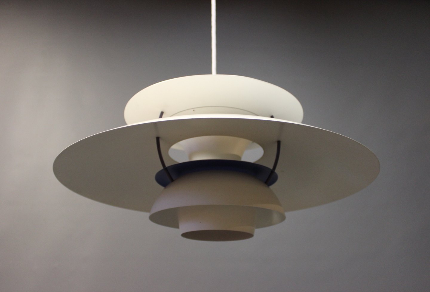PH5 lamp designed by Poul Henningsen in 1958 and produced by Louis Poulsen. The lamp has white lacquered metal shades.