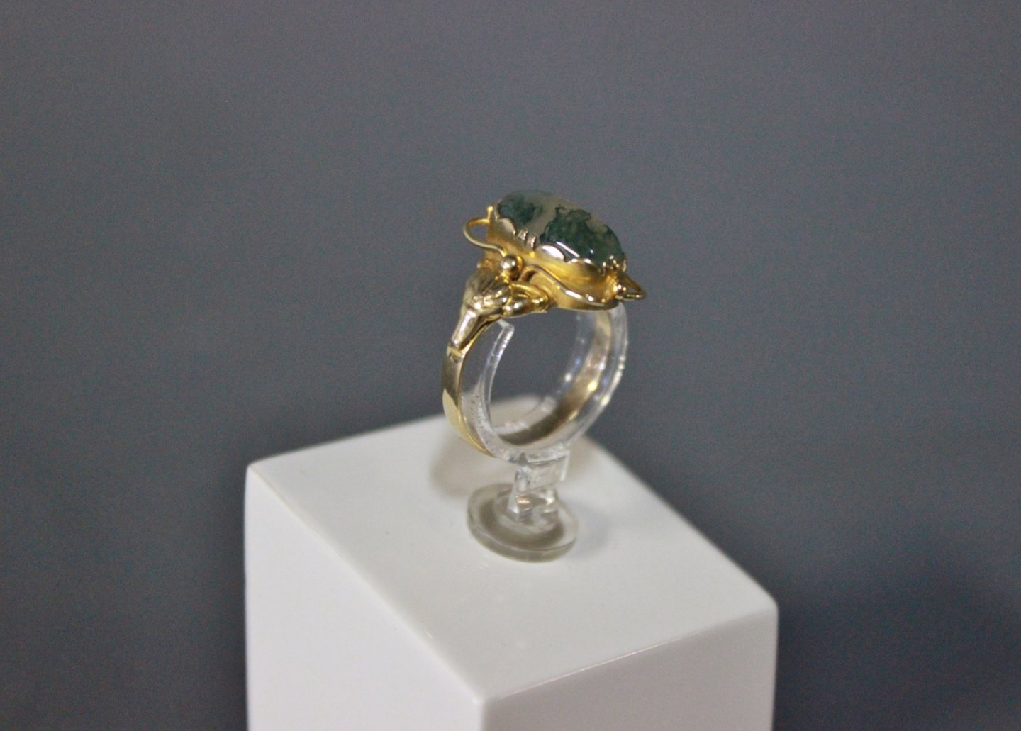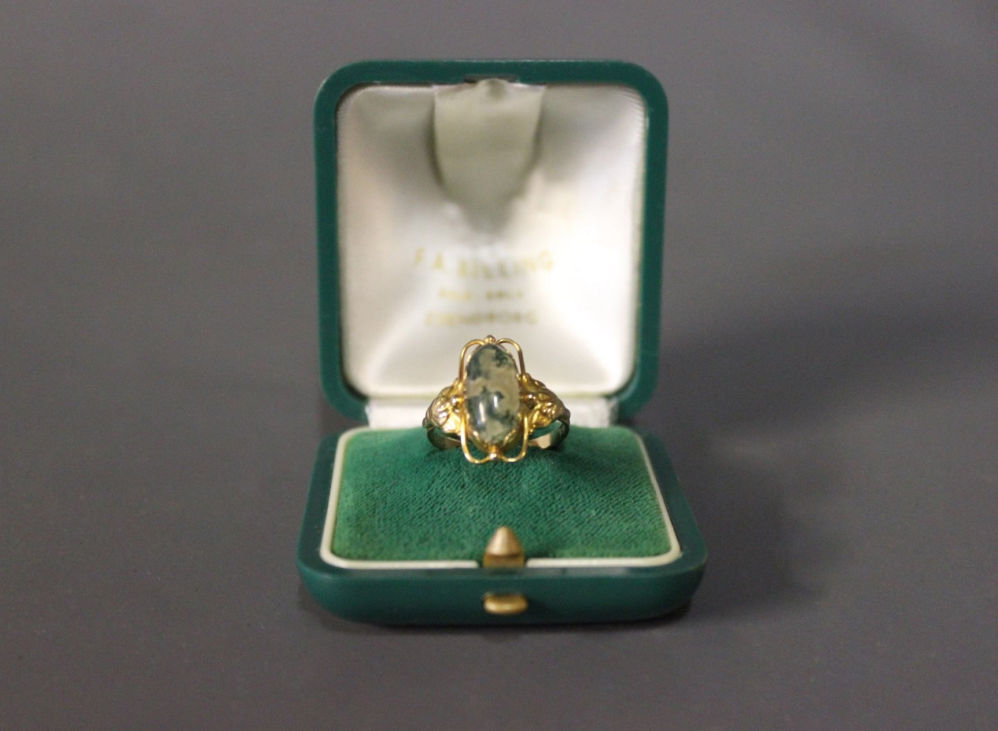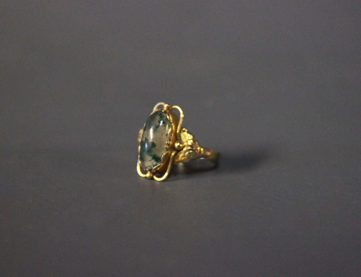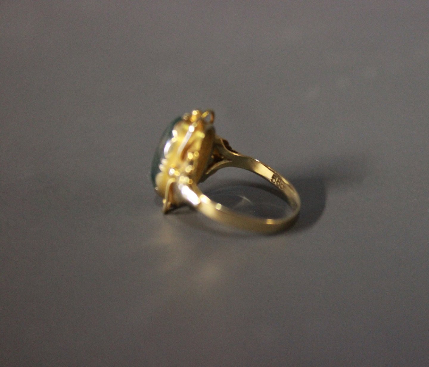 14 ct. goldring with beautiful green stone, stamped TSL.