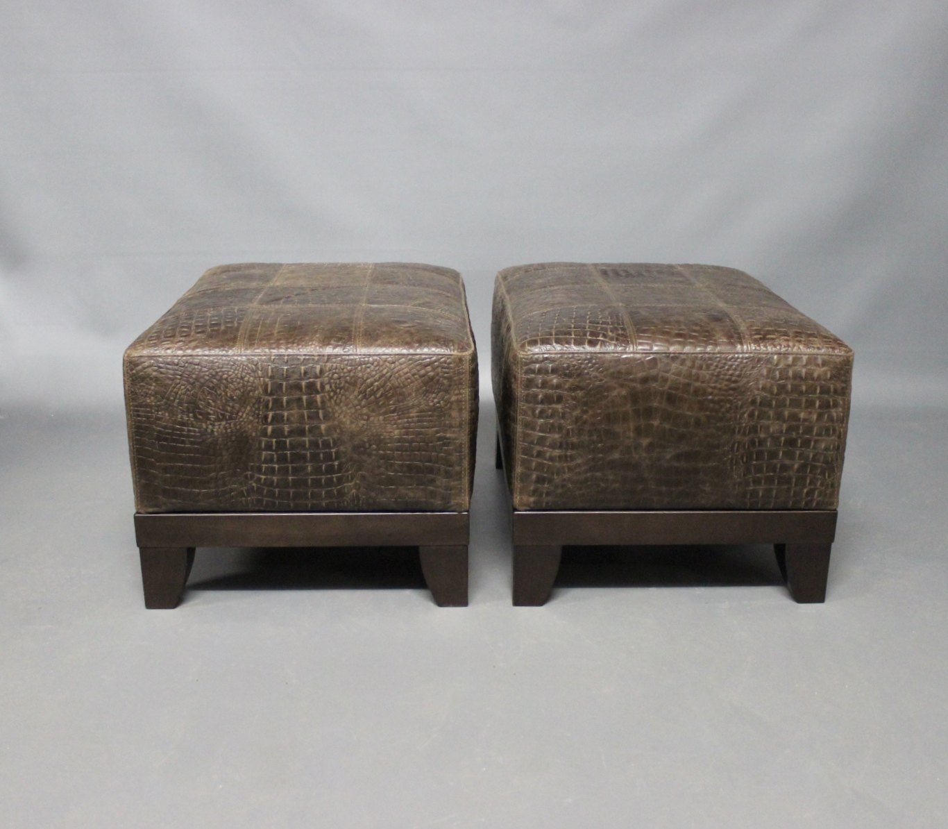 A pair of easy chairs in dark Brown leather with stools from the Italian brand Smania.
