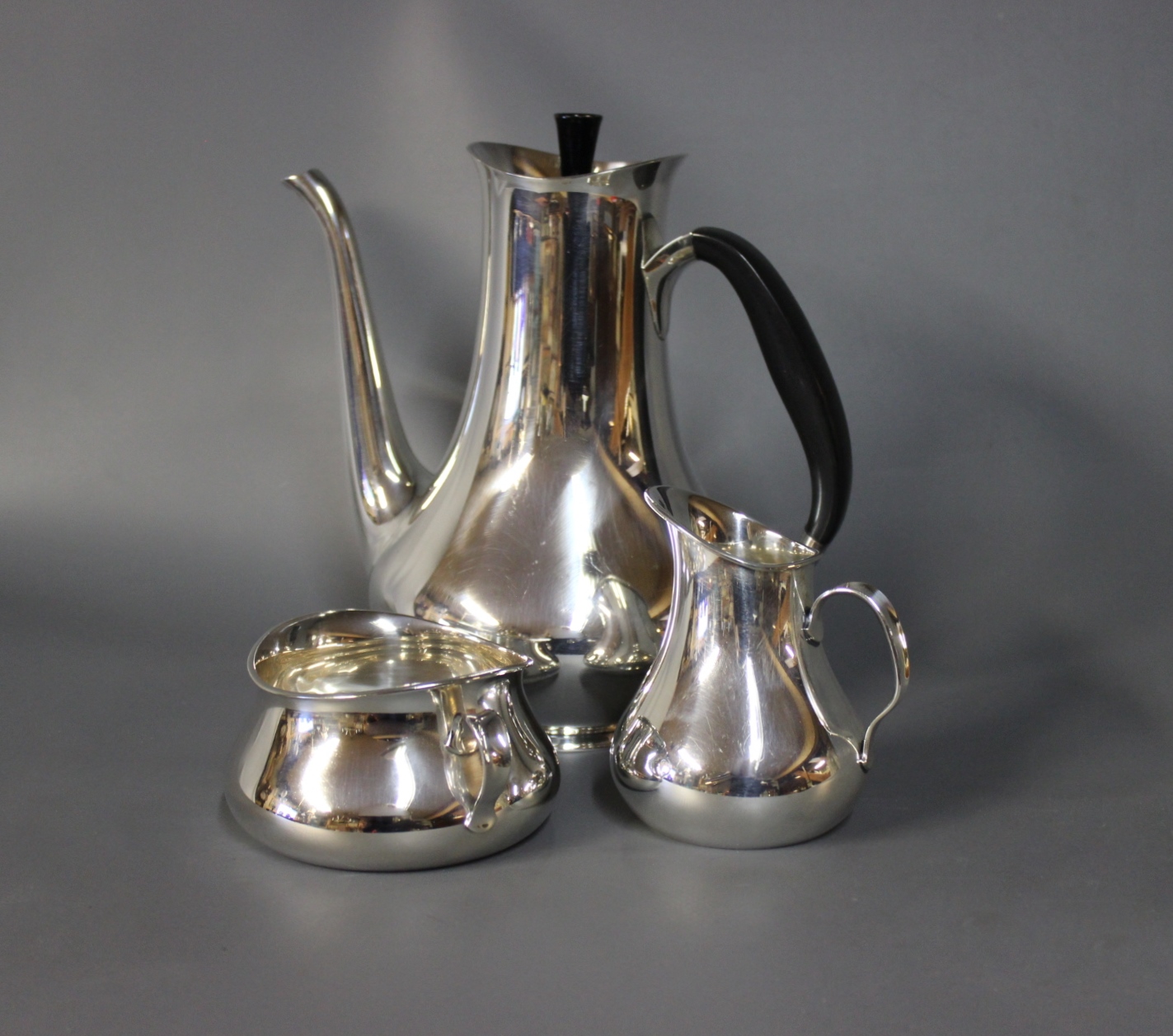 Coffee serving set consisting of Coffee jug with Black Ebony handle, cream jug and sugar bowl, either in 830 s or hallmarked silver.