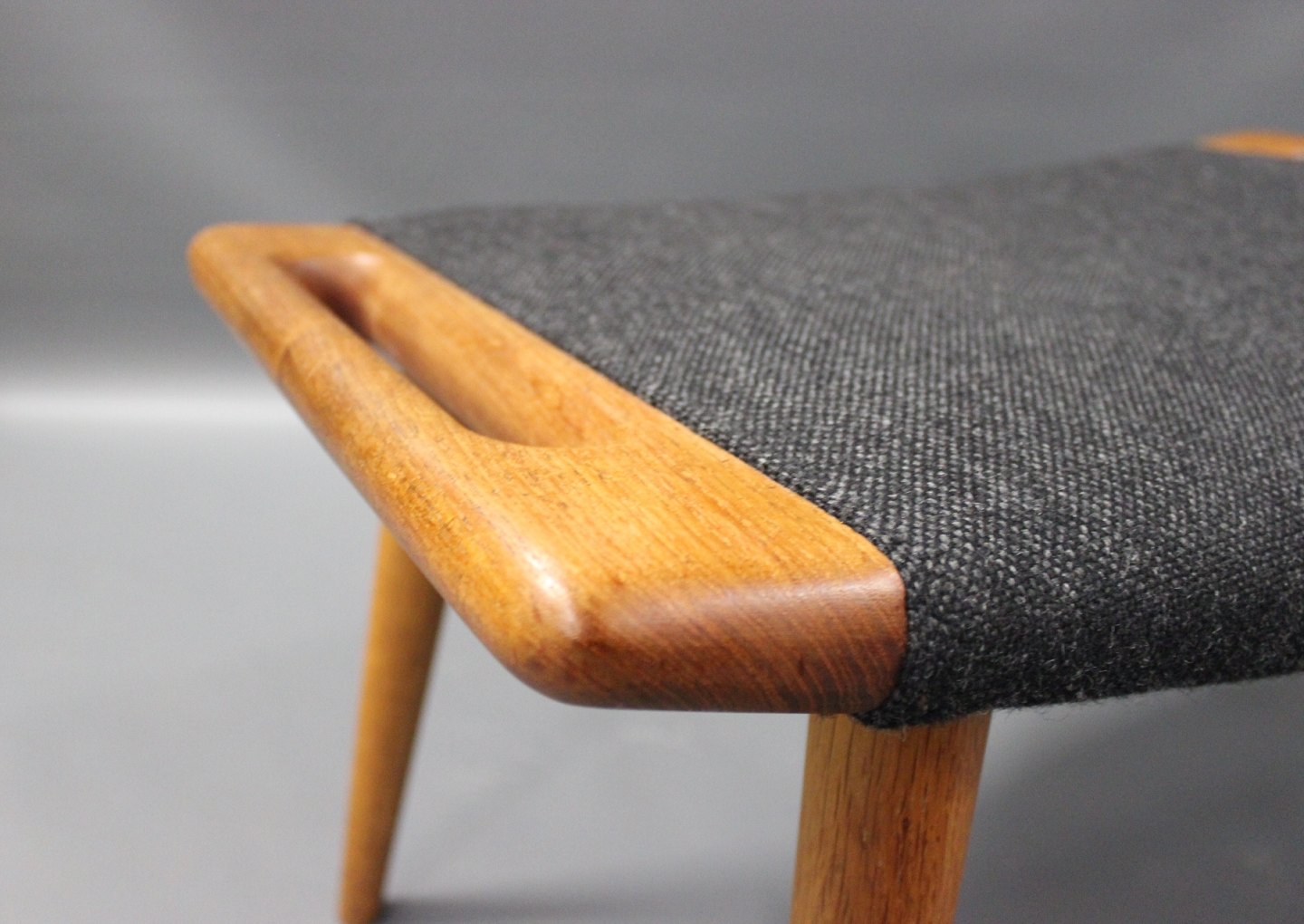 Stool for the Papa Bear chair, model PP120, designed by Hans J. Wegner in 1954 and manufactured by P.P. Furniture. The stool is upholstered in dark grey Hallingdal wool and with legs of Teak.