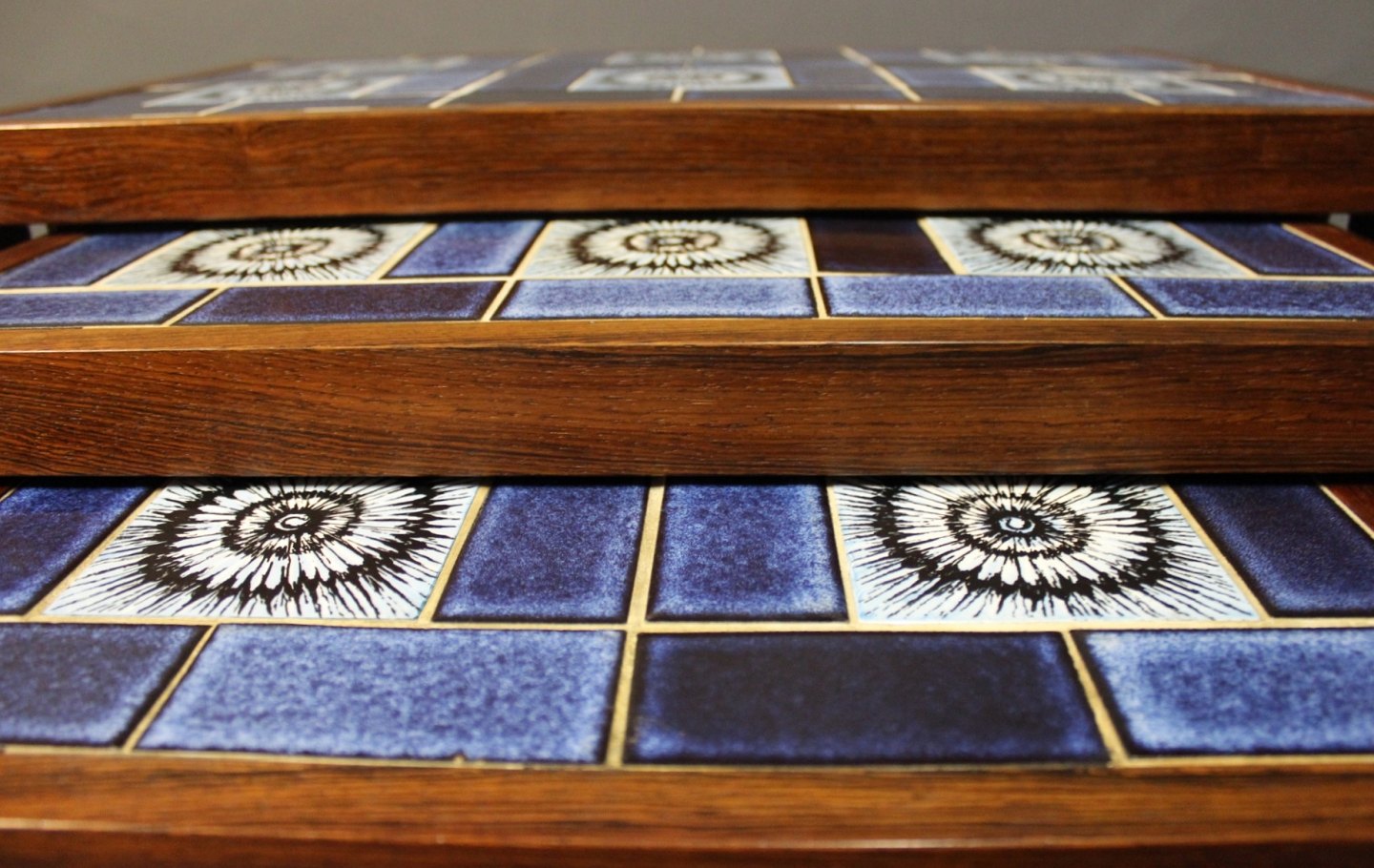 SoldA set of nesting tables in rosewood with tiles in blue colors, Danish Design from the 1960s.