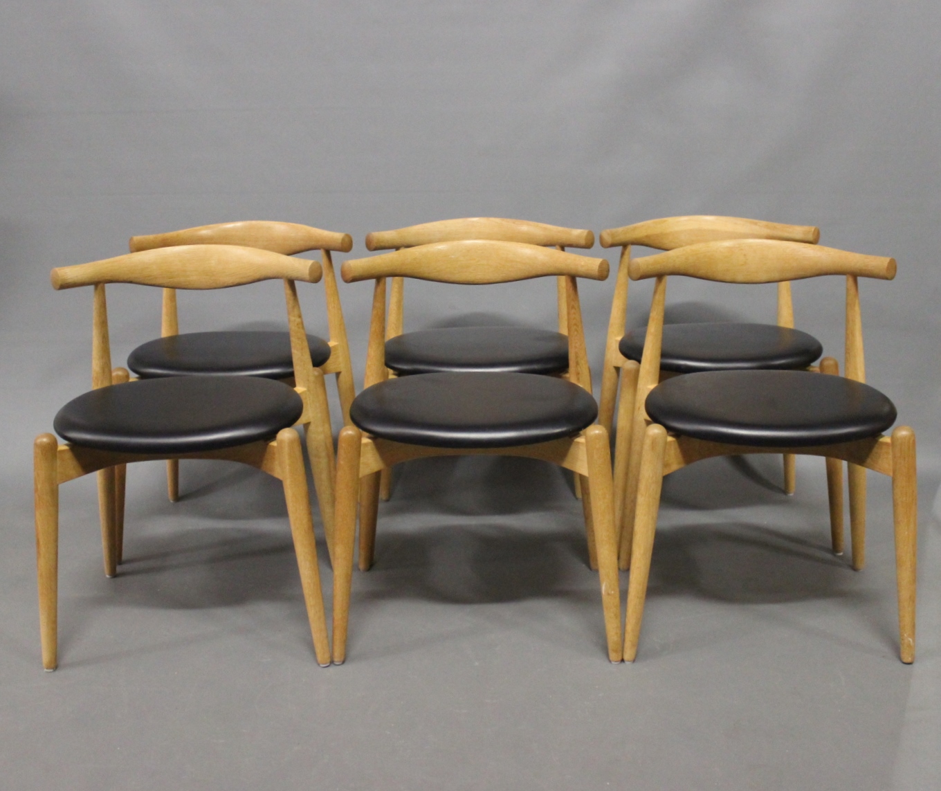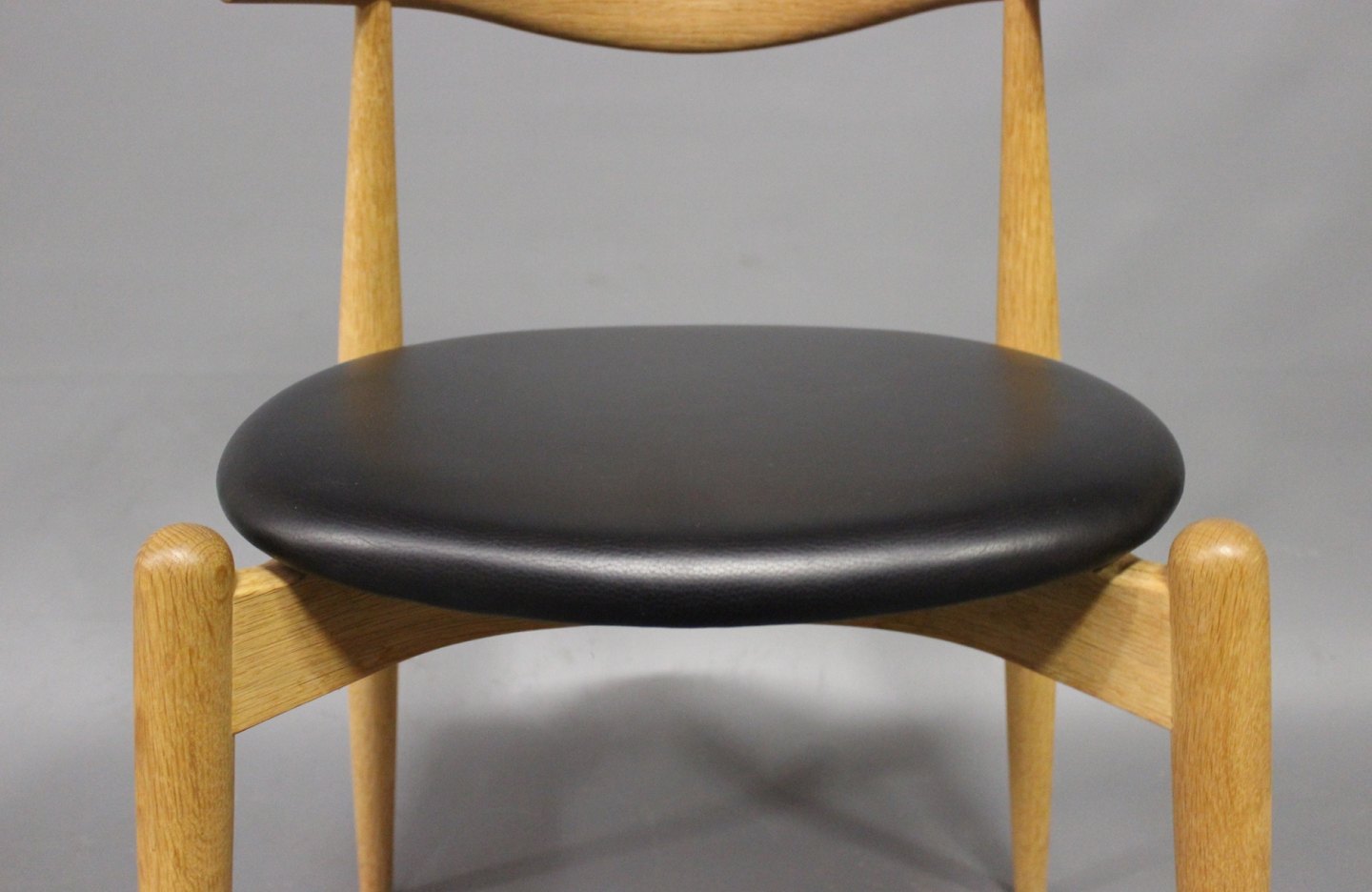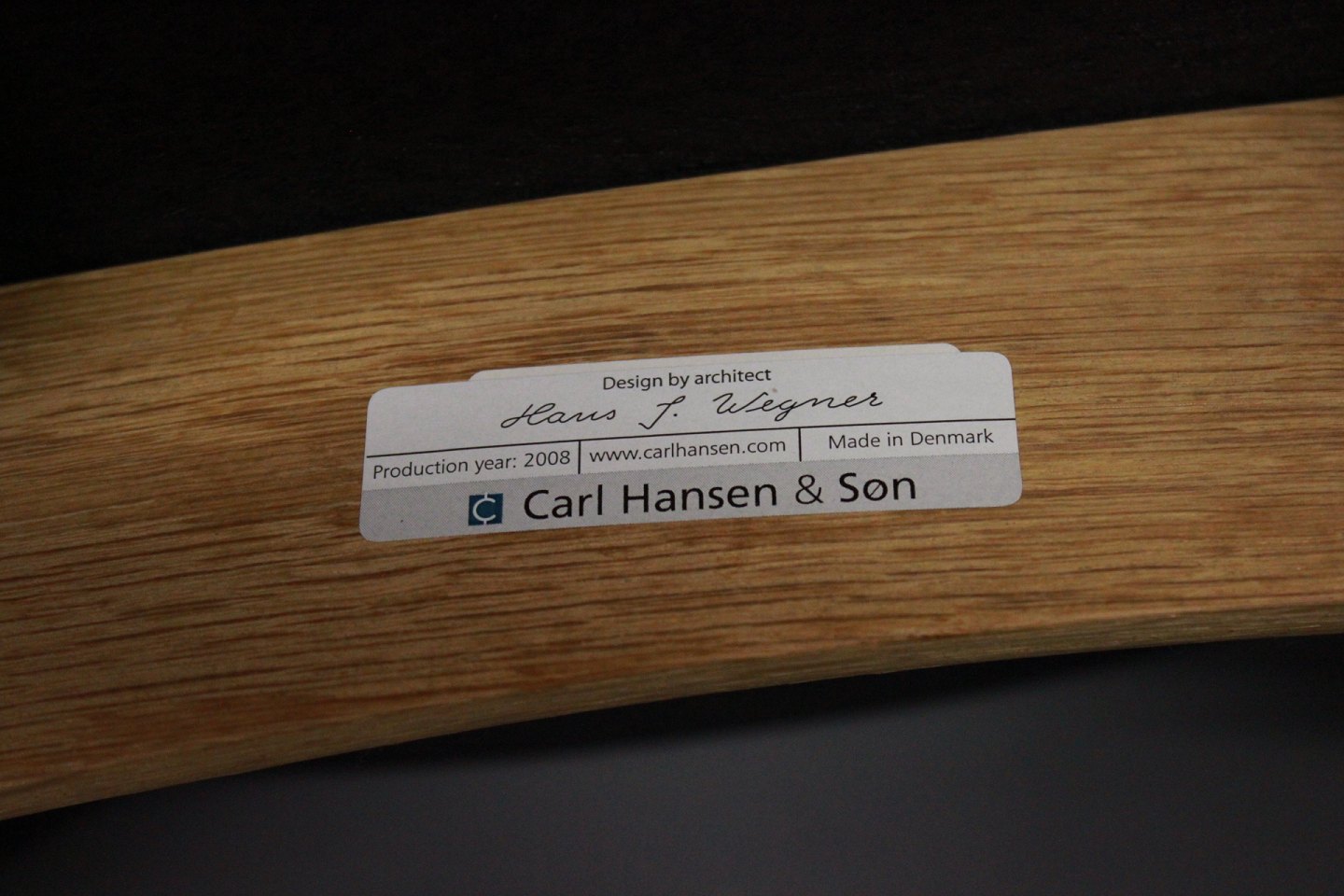 SoldA set of 6, Elbow chairs, CH20, designed by Hans J. Wegner in 1956 and manufactured by Carl Hansen & Son in 2008. The chairs are of oak and with seats of black leather.