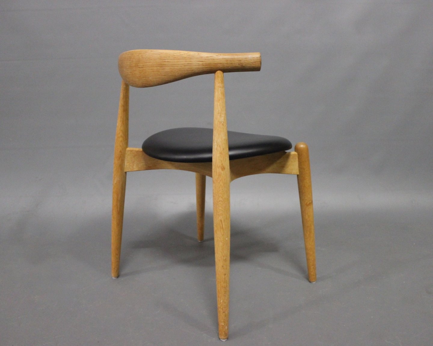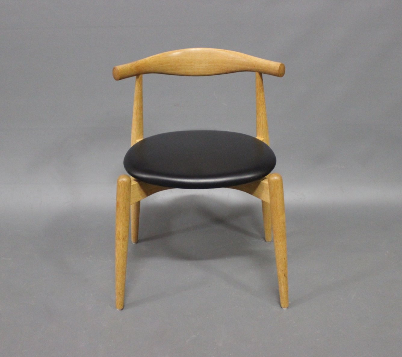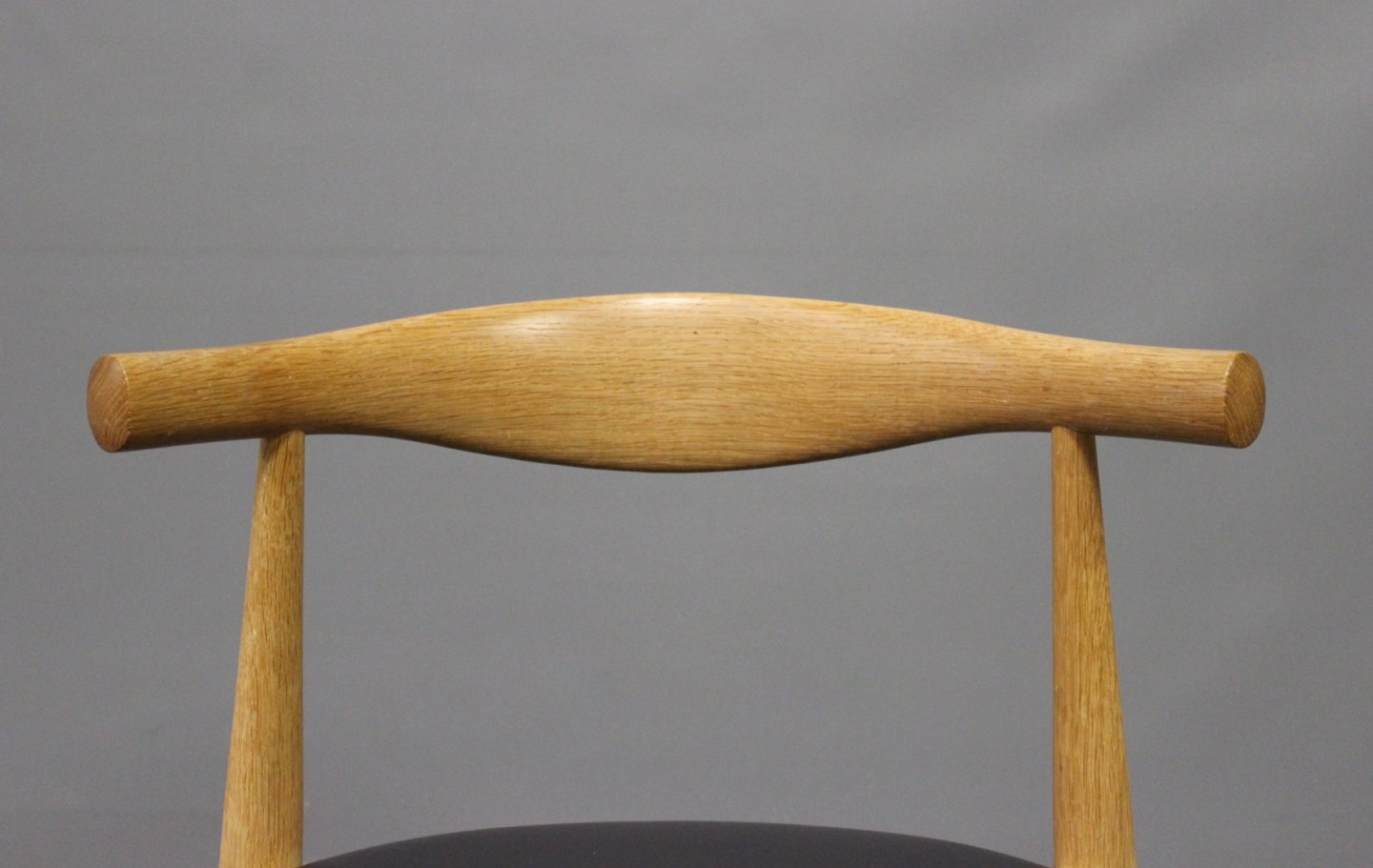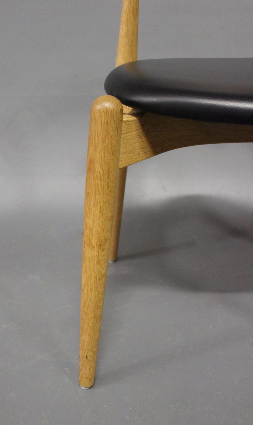 SoldA set of 6, Elbow chairs, CH20, designed by Hans J. Wegner in 1956 and manufactured by Carl Hansen & Son in 2008. The chairs are of oak and with seats of black leather.