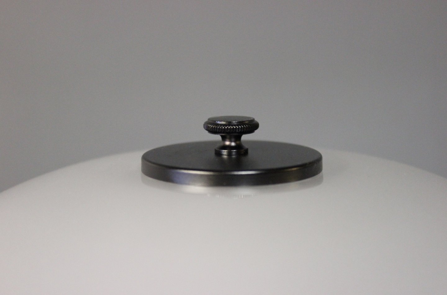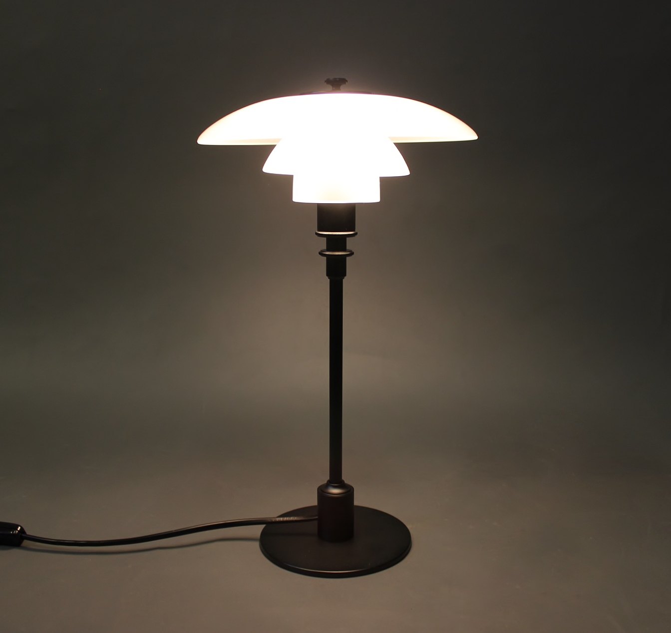 PH 2/1 bordlampe, jubilæums model, designet af Poul Henningsen og fremstillet hos Louis Poulsen. Lampen er med skærme af mat opalglas og sort lakeret stel.