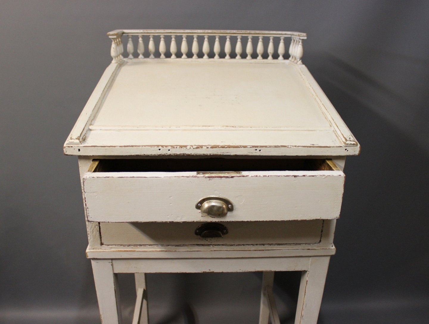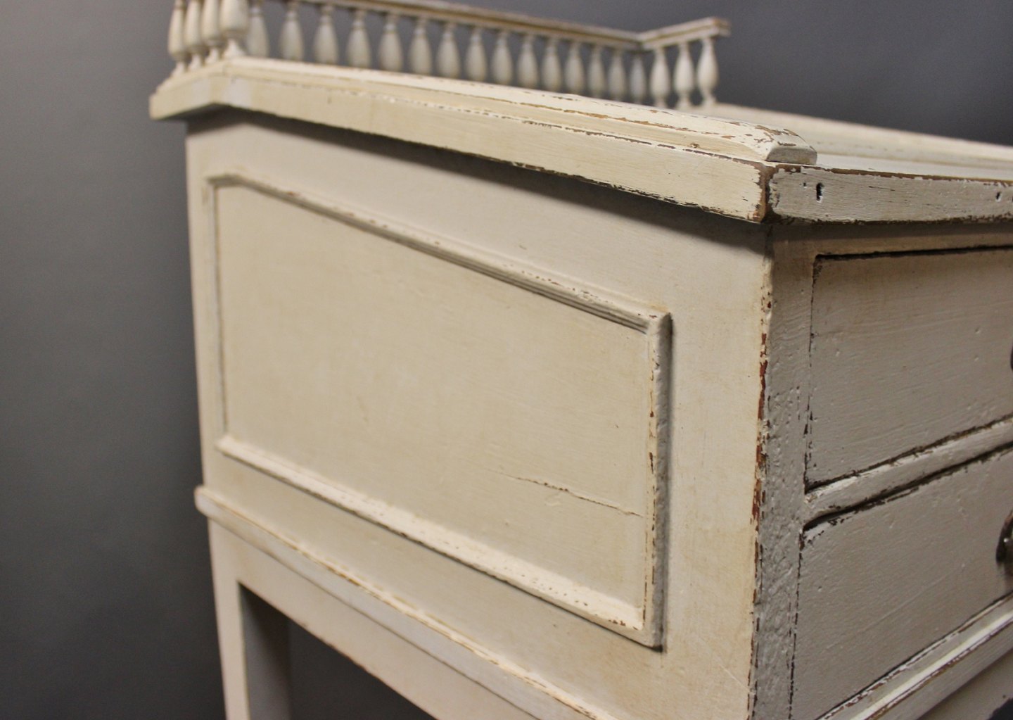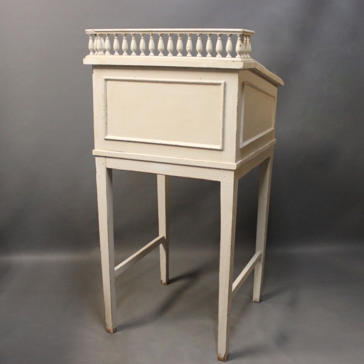 Gråmalet skrivepult i stilen gustaviansk fra 1840erne. Skrivepulten er fritstående samt er den stemplet med Nordisk Films Kompagni.