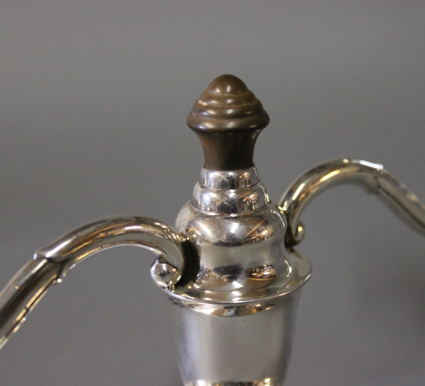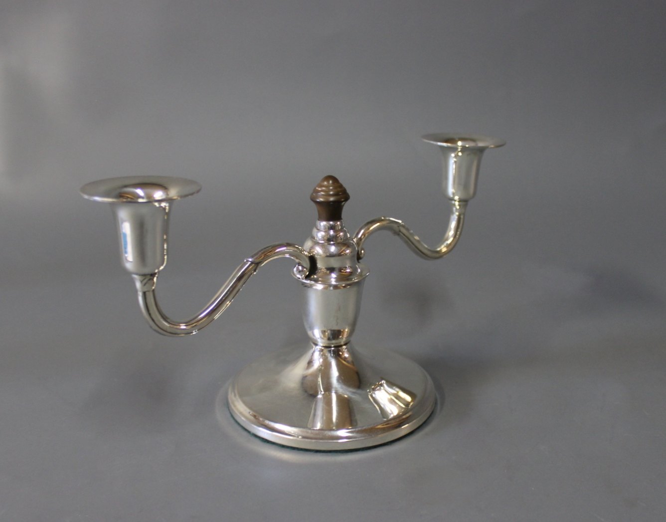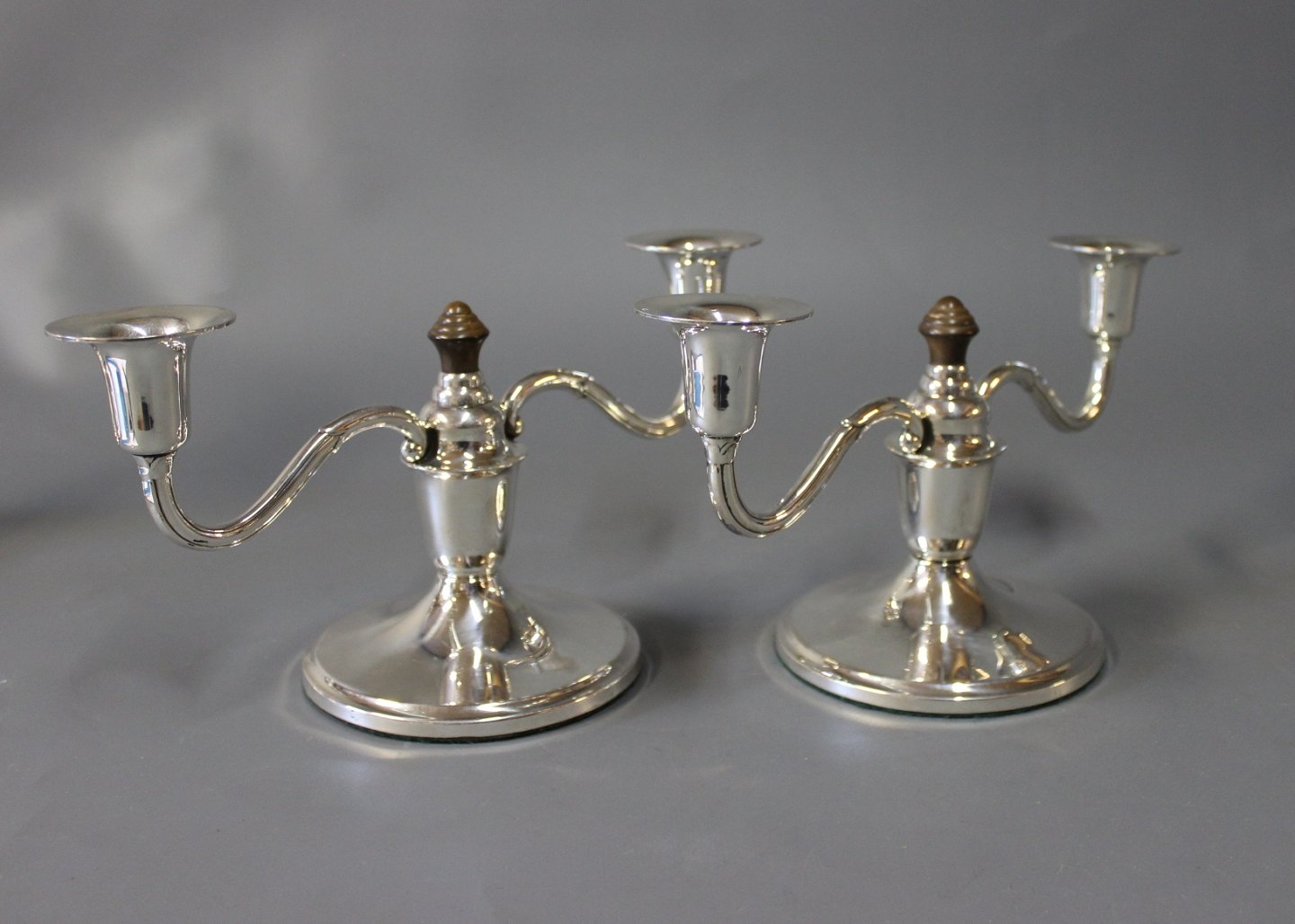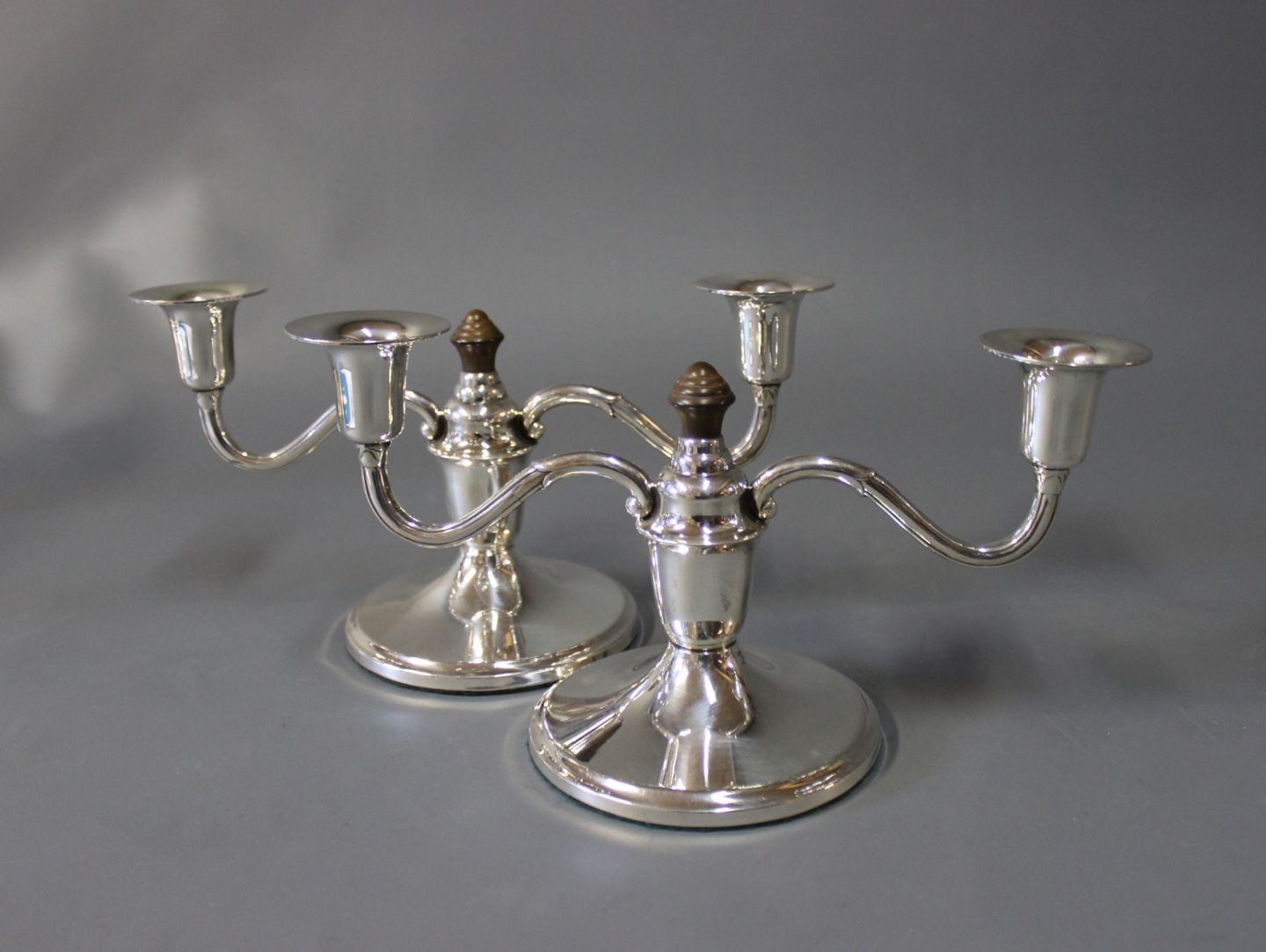 A pair of two-armed candlesticks in hallmarked silver an decorated with ebony, stamped SJ.