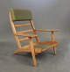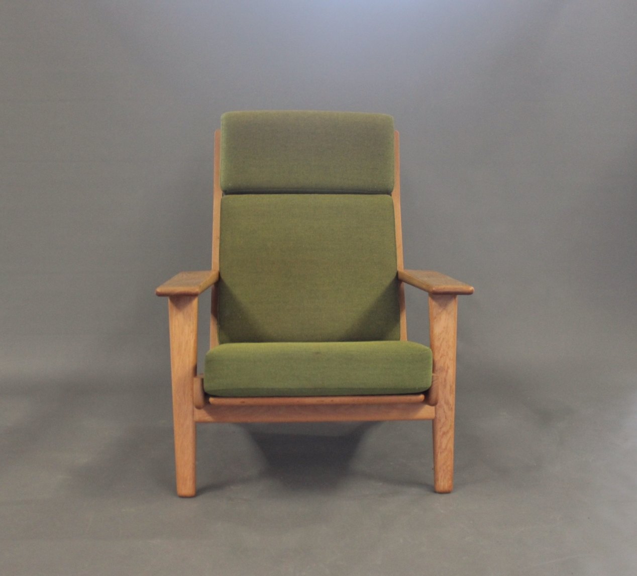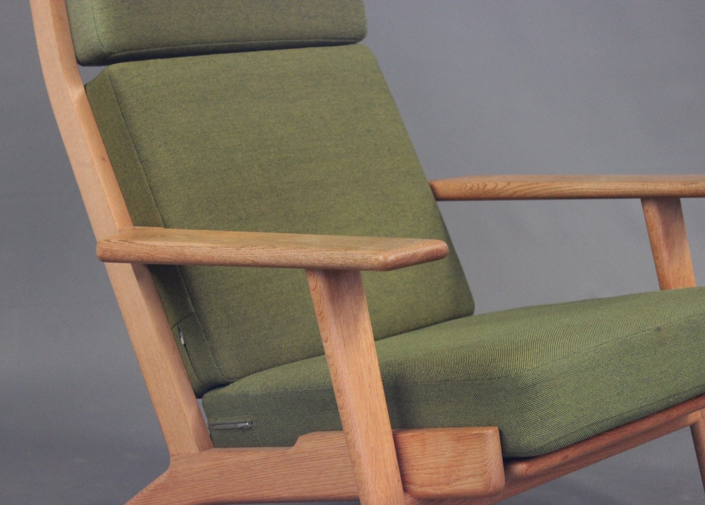 SoldA pair of armchairs with high backs, model GE290A, designed by Hans J. Wegner in the 1950s and manufactured by GETAMA in the 1960s. The chairs are made of oak and the cushions are of dark green upholstery. We have 1 left.