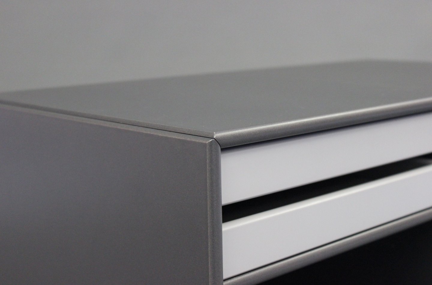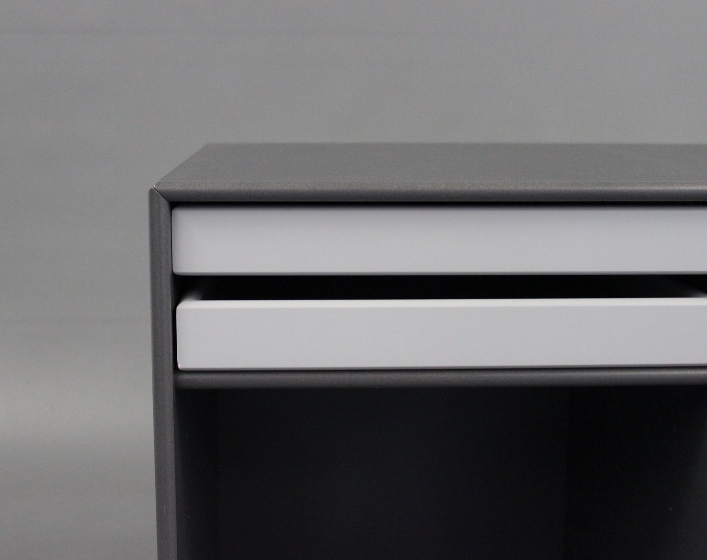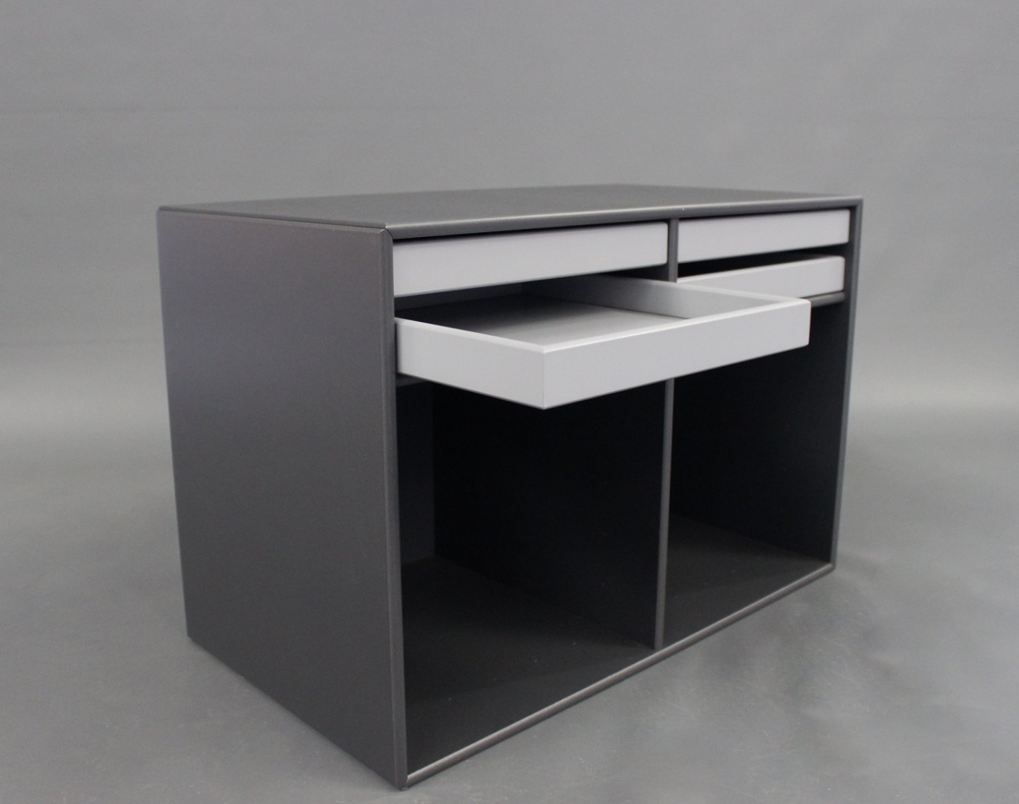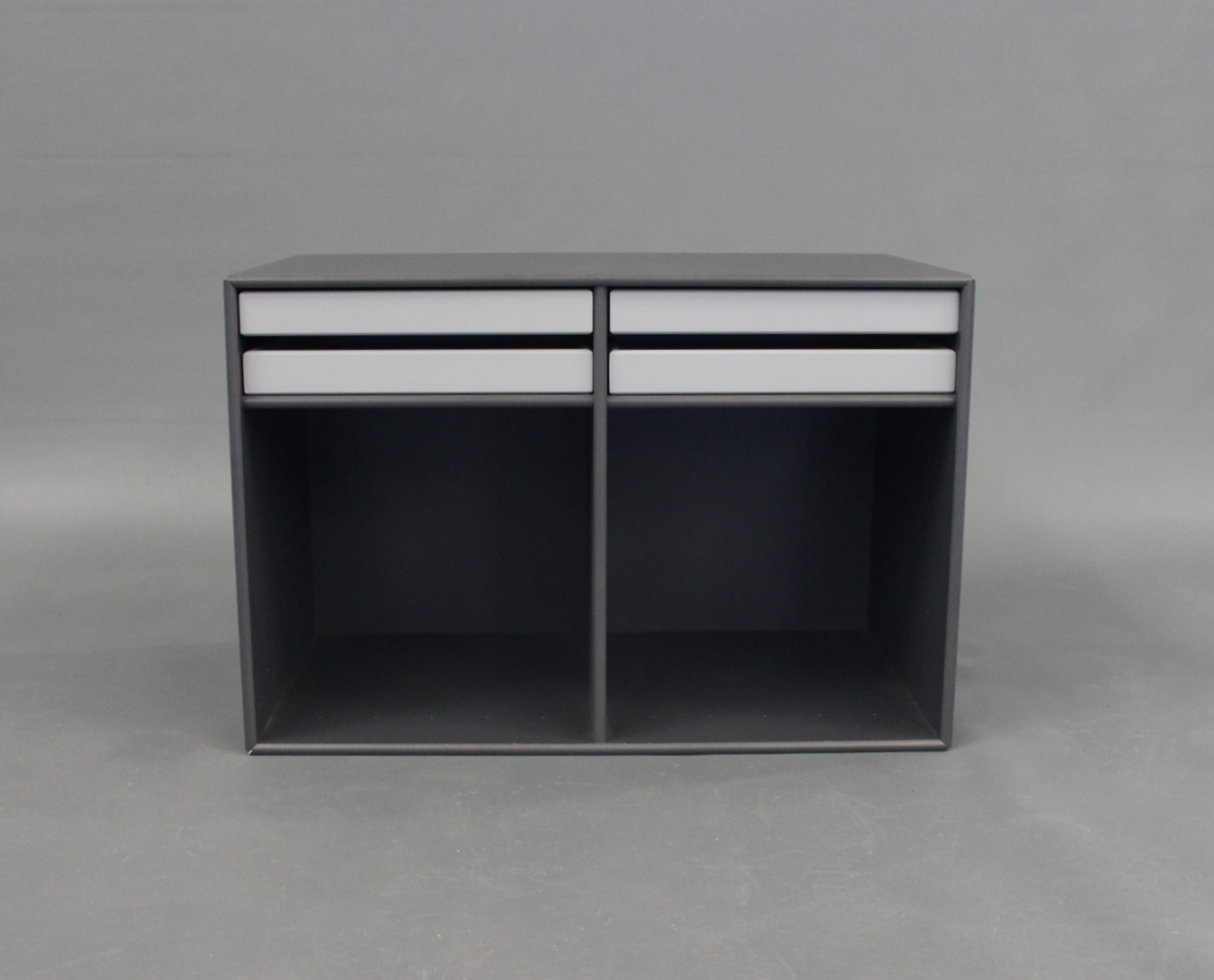 Denne Montana reol i mørkegrå med fire små skuffer er blot en af flere forskellige varianter, vi tilbyder. Med sit stilfulde design og alsidige opbevaringsmuligheder er denne reol en praktisk og æstetisk tilføjelse til ethvert rum.