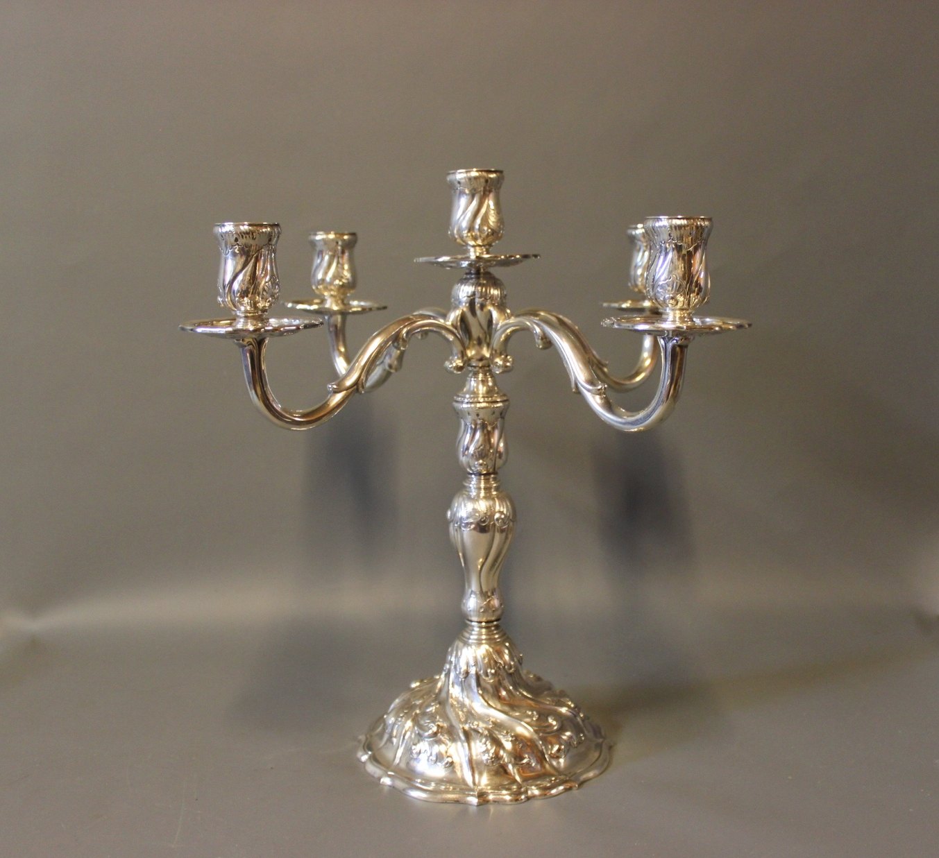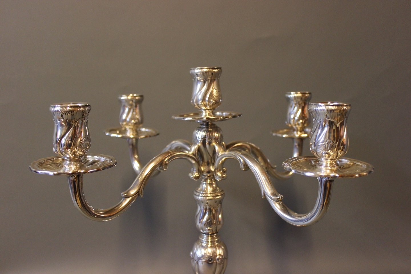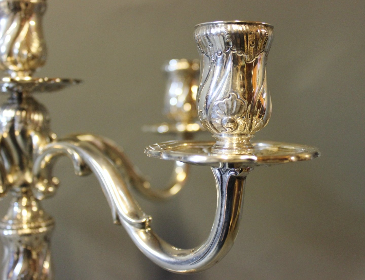 SoldA pair of five armed candlabras in 925 sterling silver by English Silver House and stamped AxS. They are newly polished and in great condition.