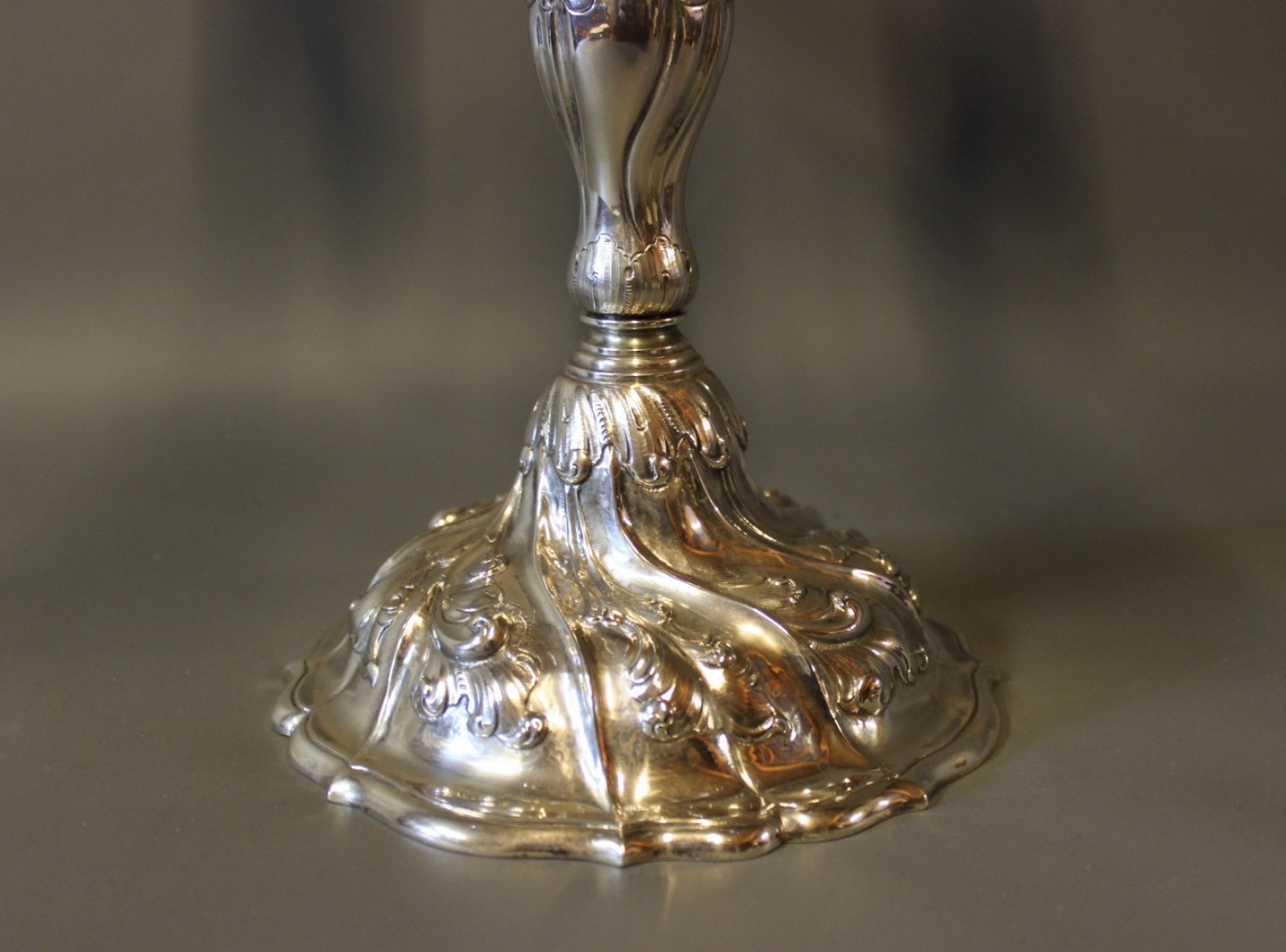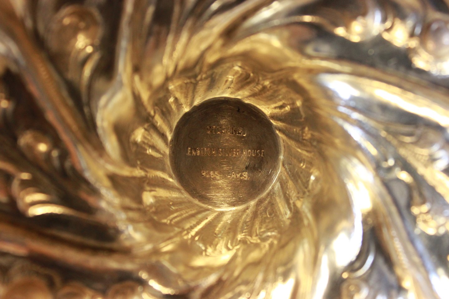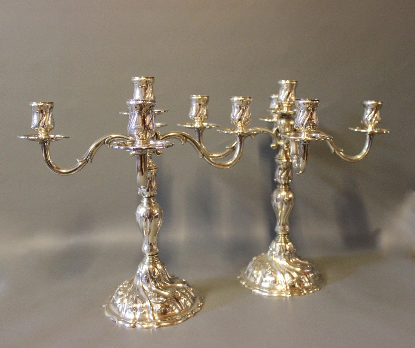 SoldA pair of five armed candlabras in 925 sterling silver by English Silver House and stamped AxS. They are newly polished and in great condition.