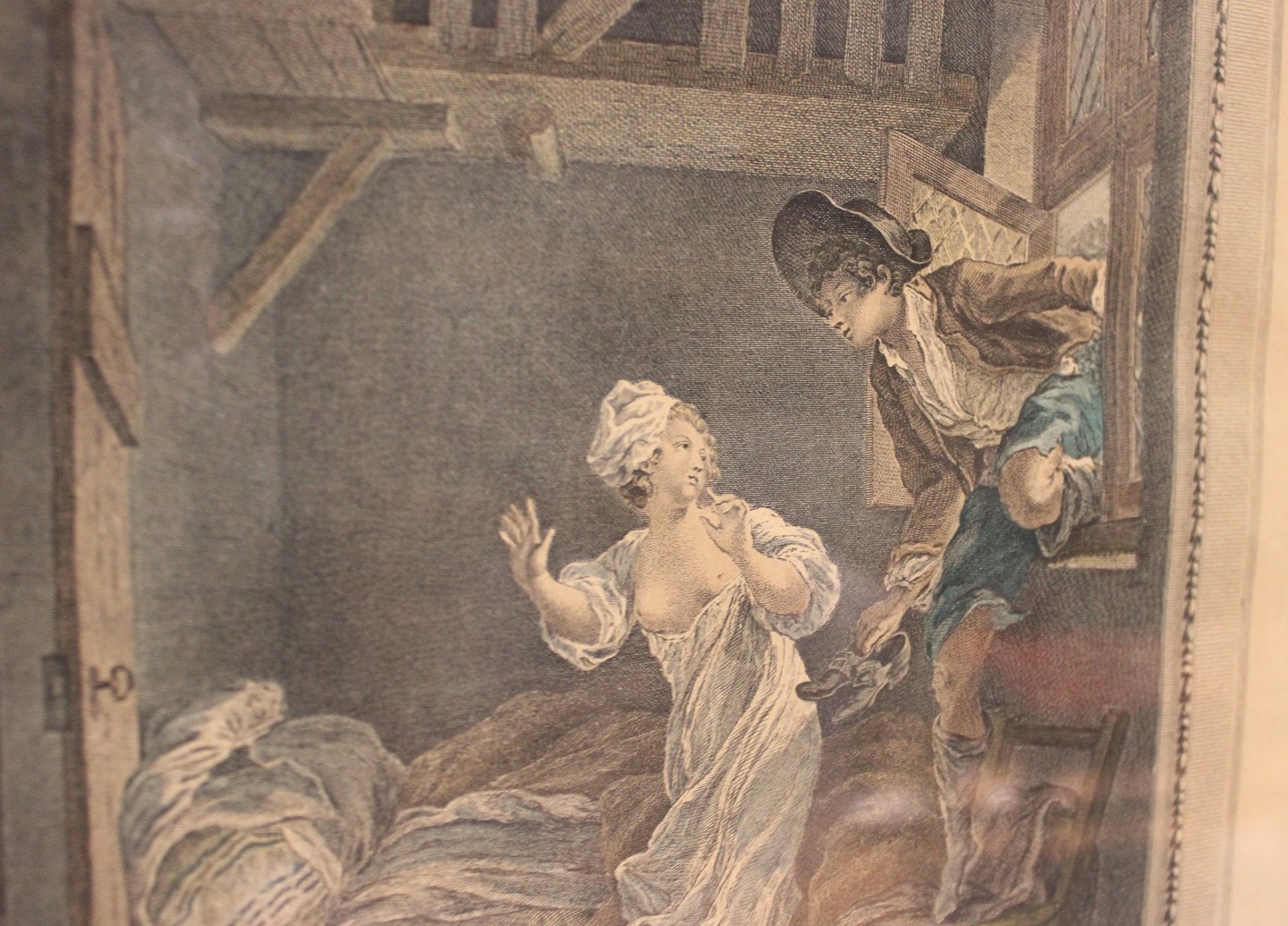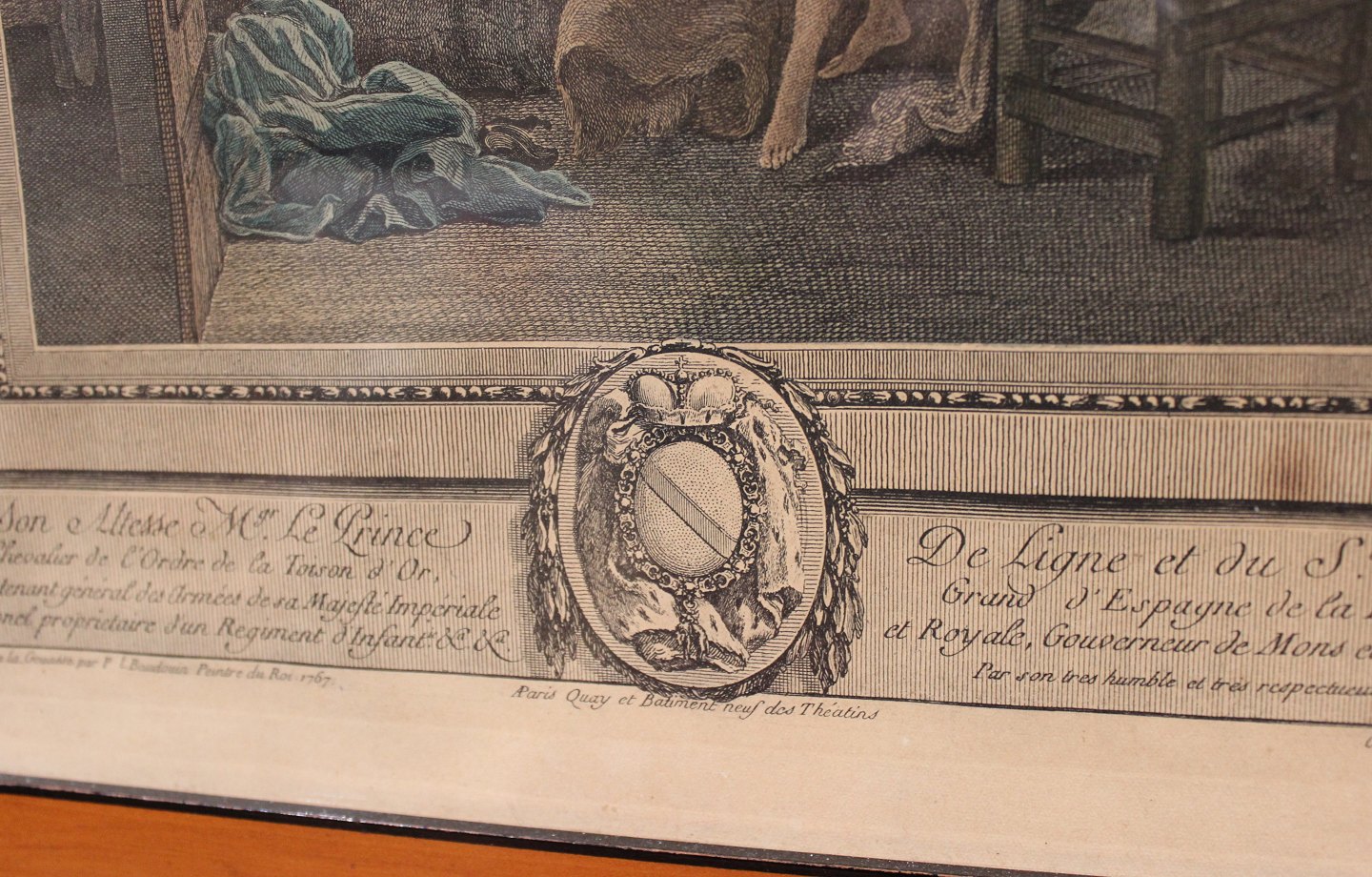 Gravering med fint motiv i to farvet træramme, i flot stand.
