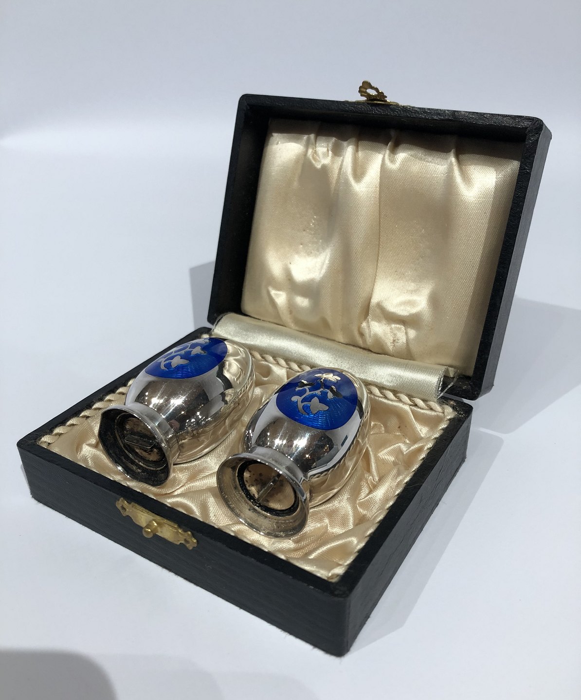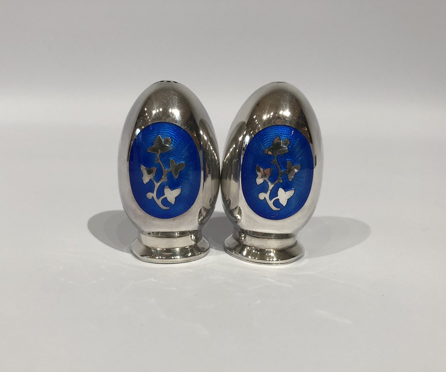 Salt and pepper shakers in 925 sterling silver and dark blue enamel by MEKA.