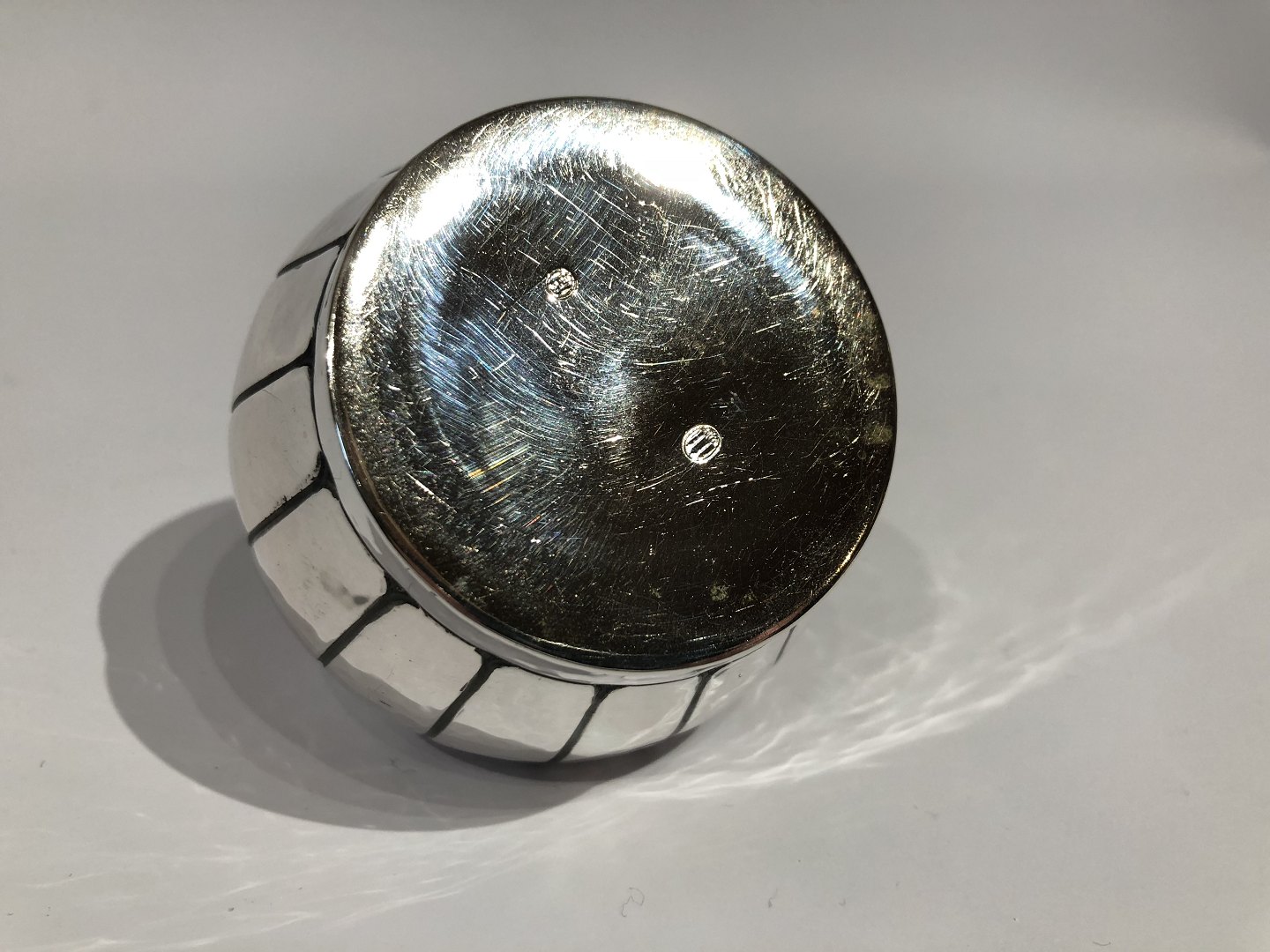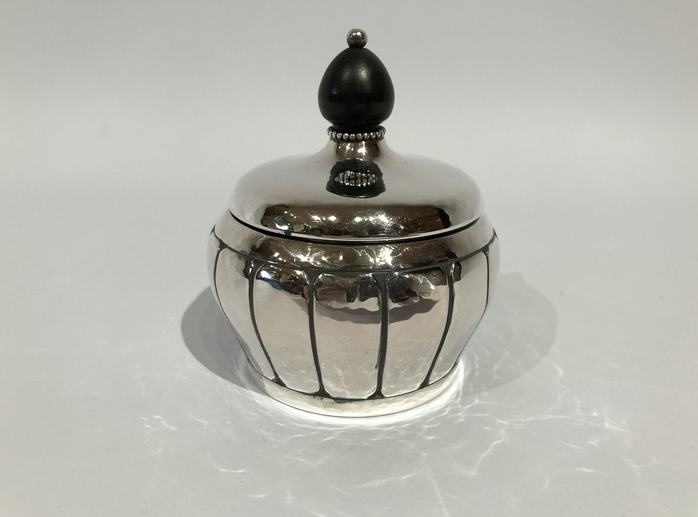 SoldSmall sugarbowl in hallmarked silver with pearl edge and ebony handle.