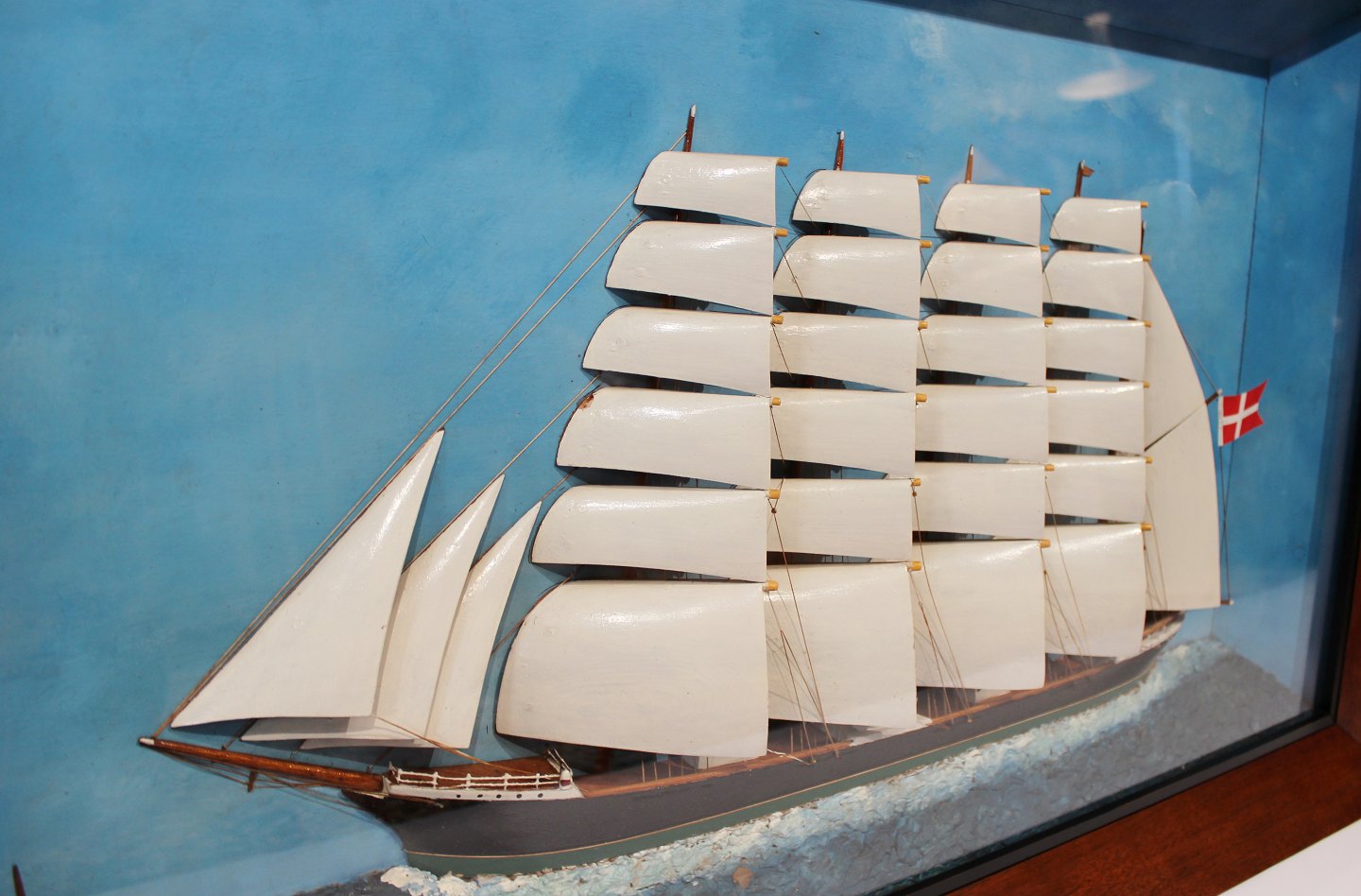 Flot dekoreret halvskib i mørk træramme fra omkring 1930erne.