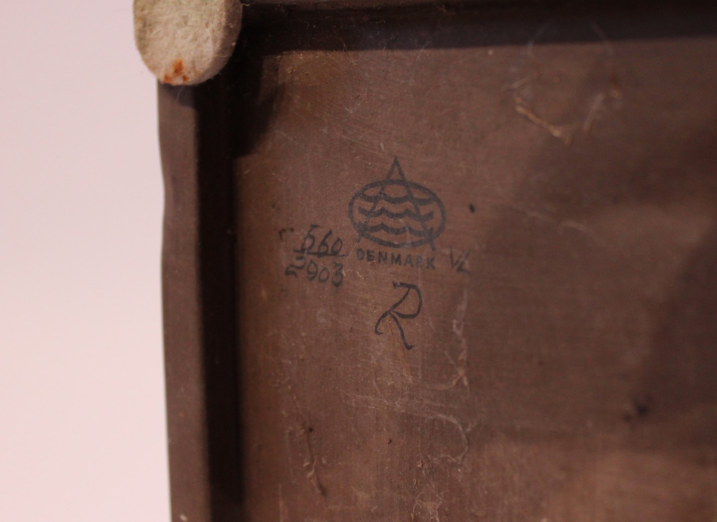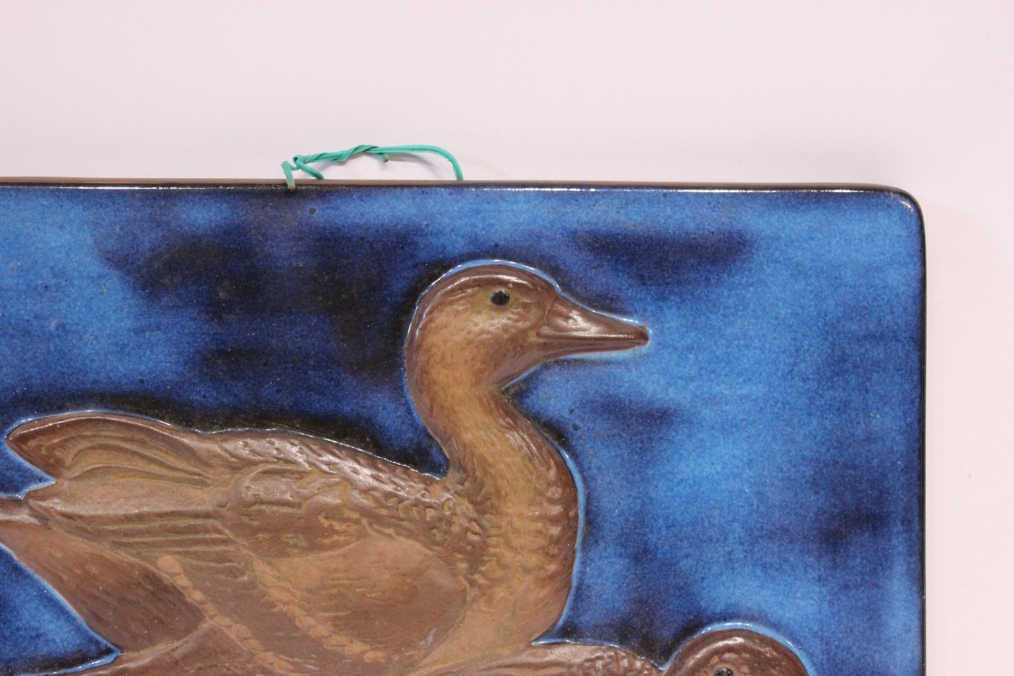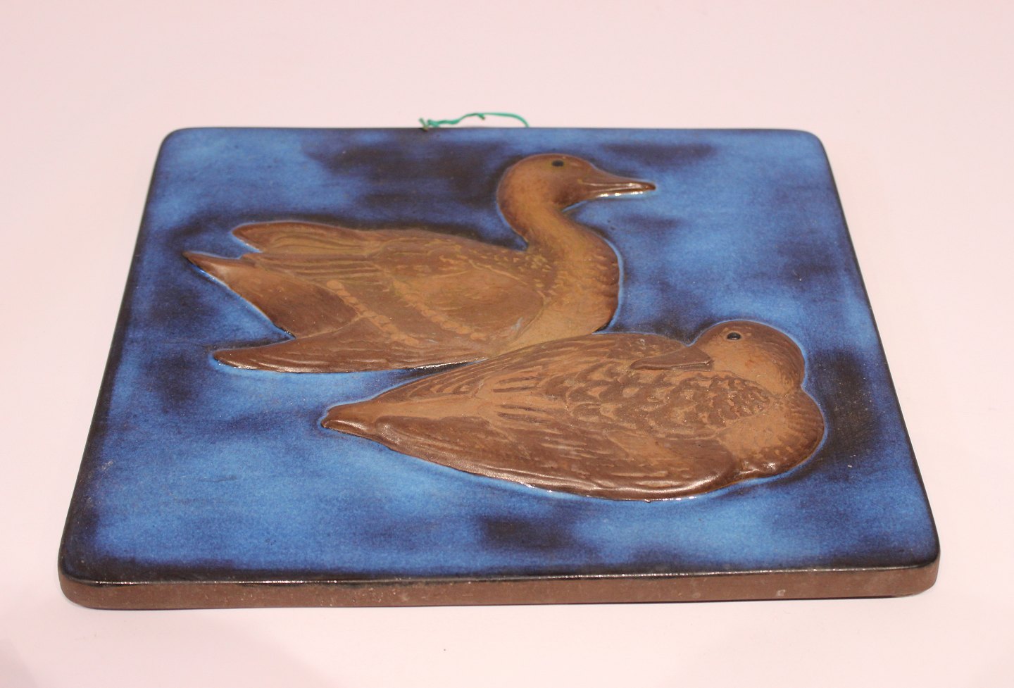 Flot keramik relief med to ænder på blå glaseret baggrund af Leif Rydeng for Alumina, nr.: 560/2903.