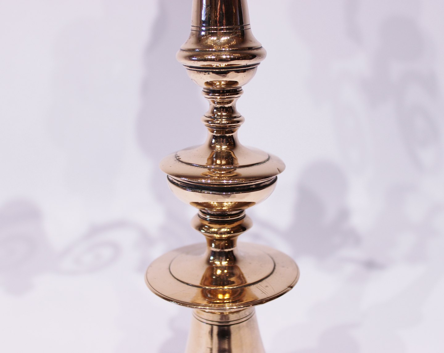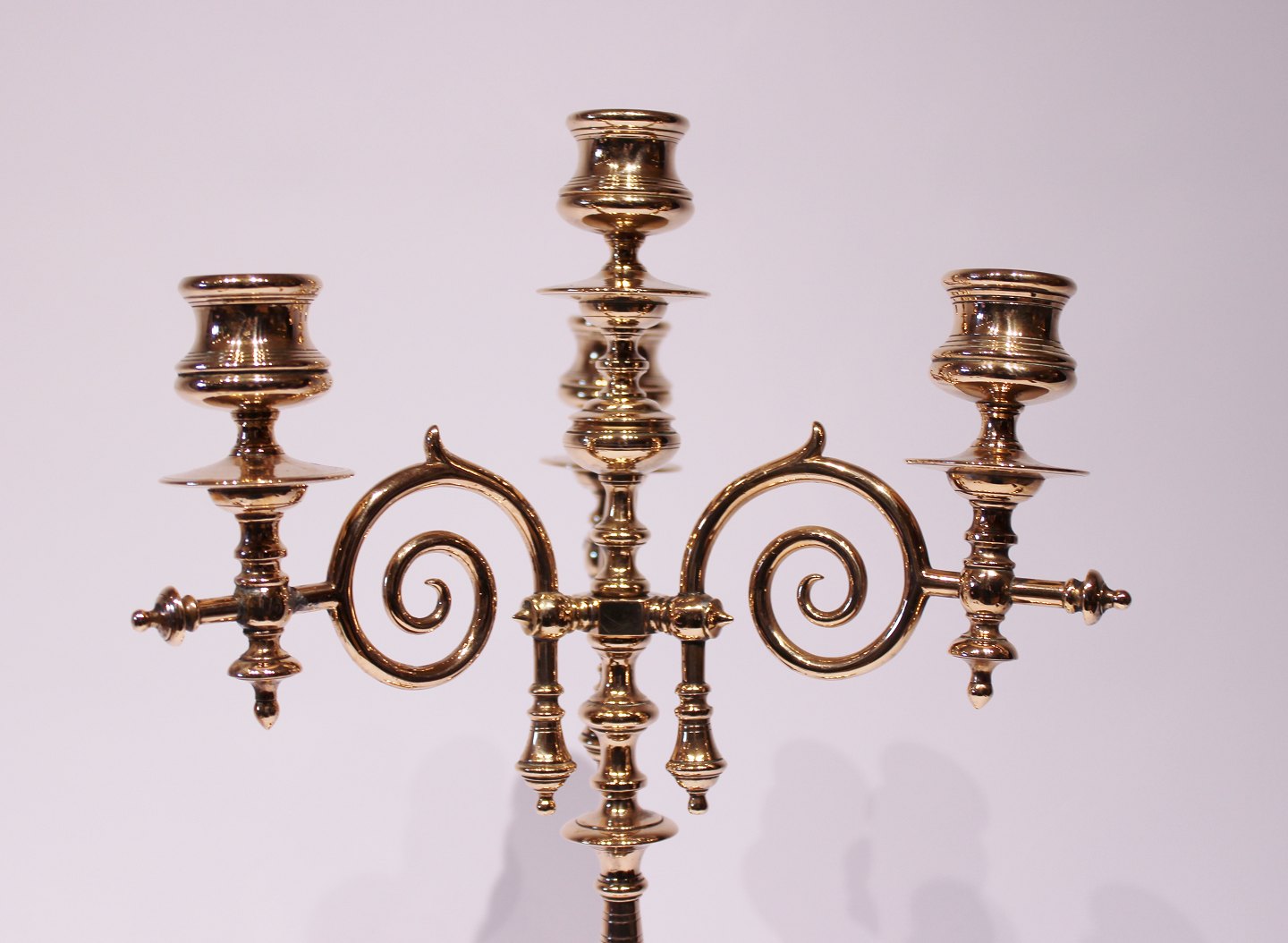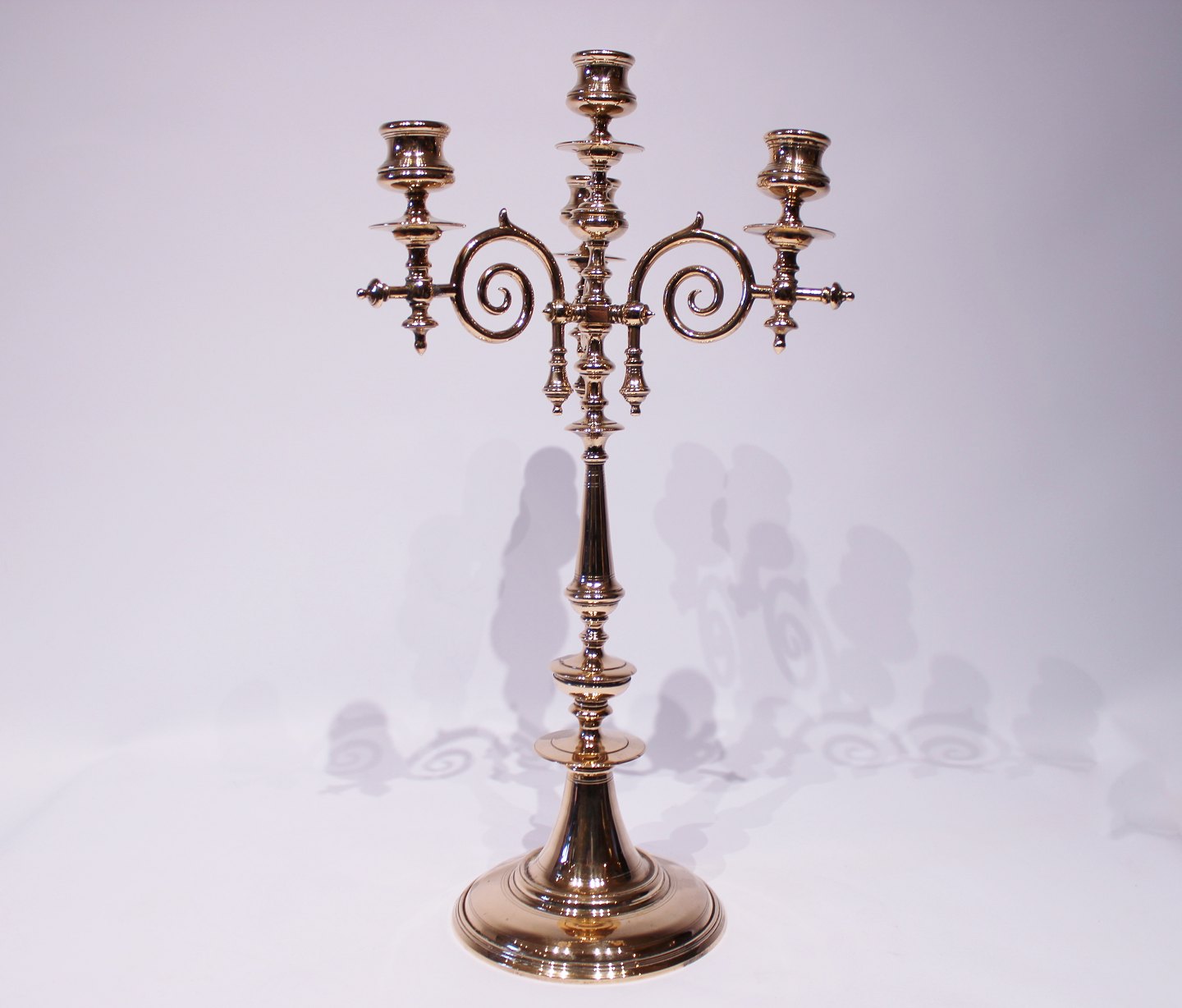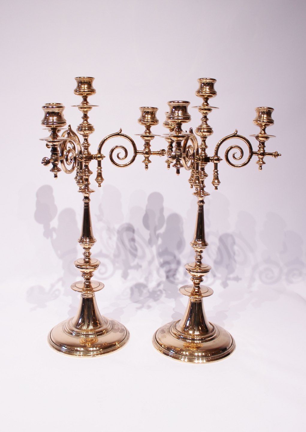 A pair of tall four armed brass candlesticks, in great vintage condition from around the 1880s.