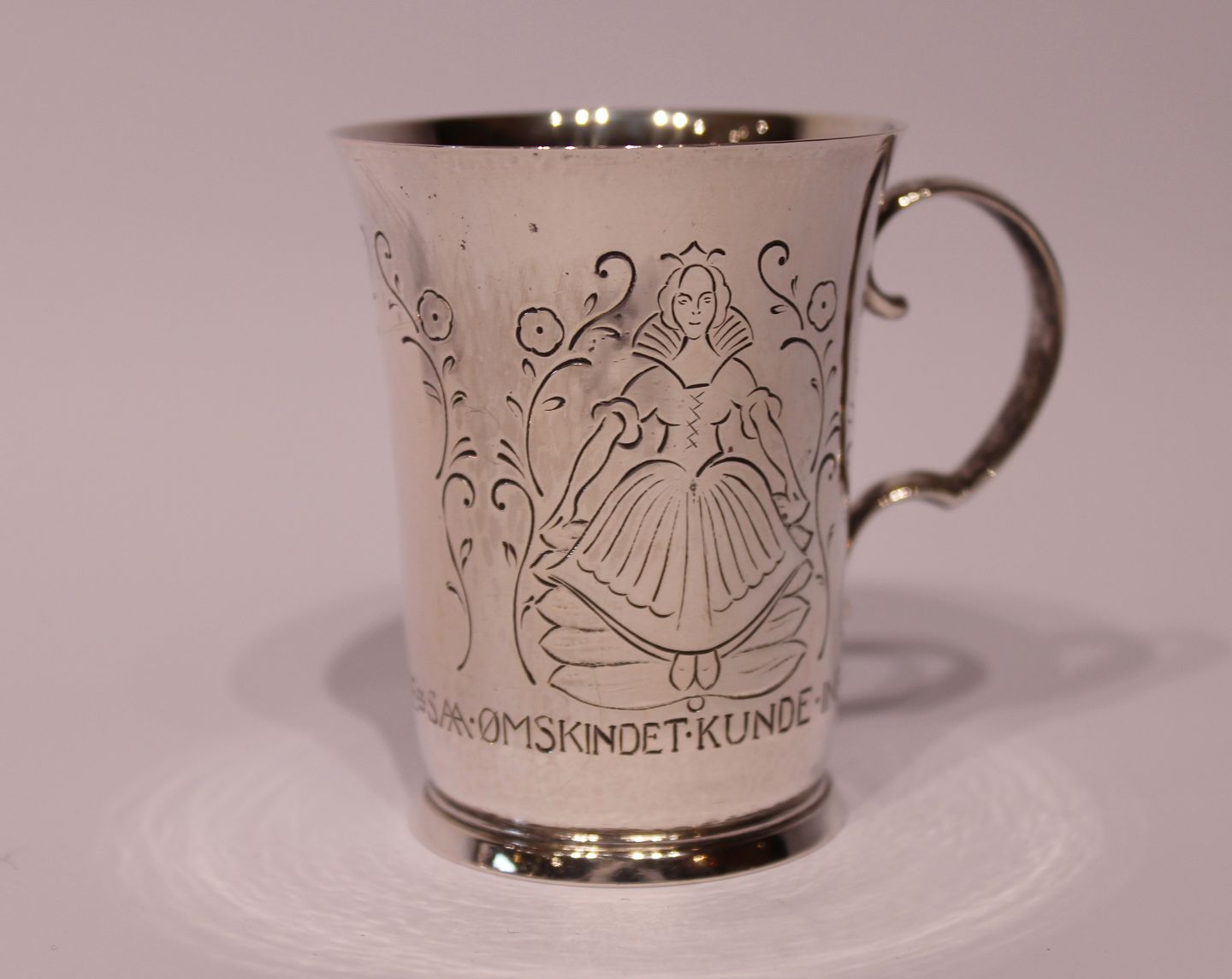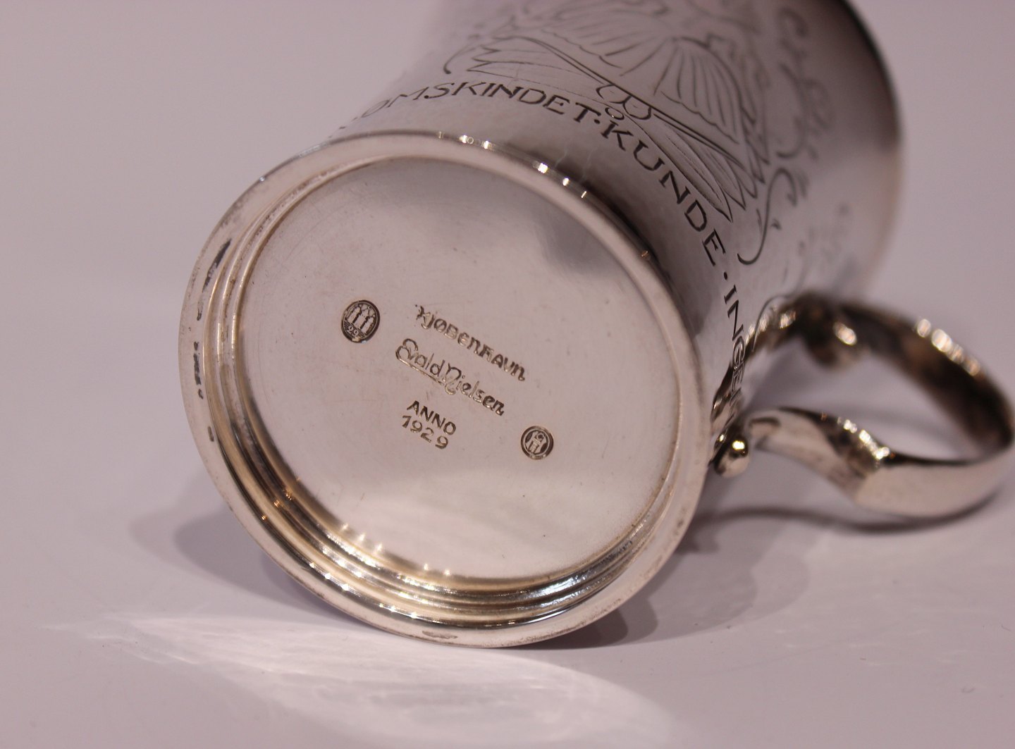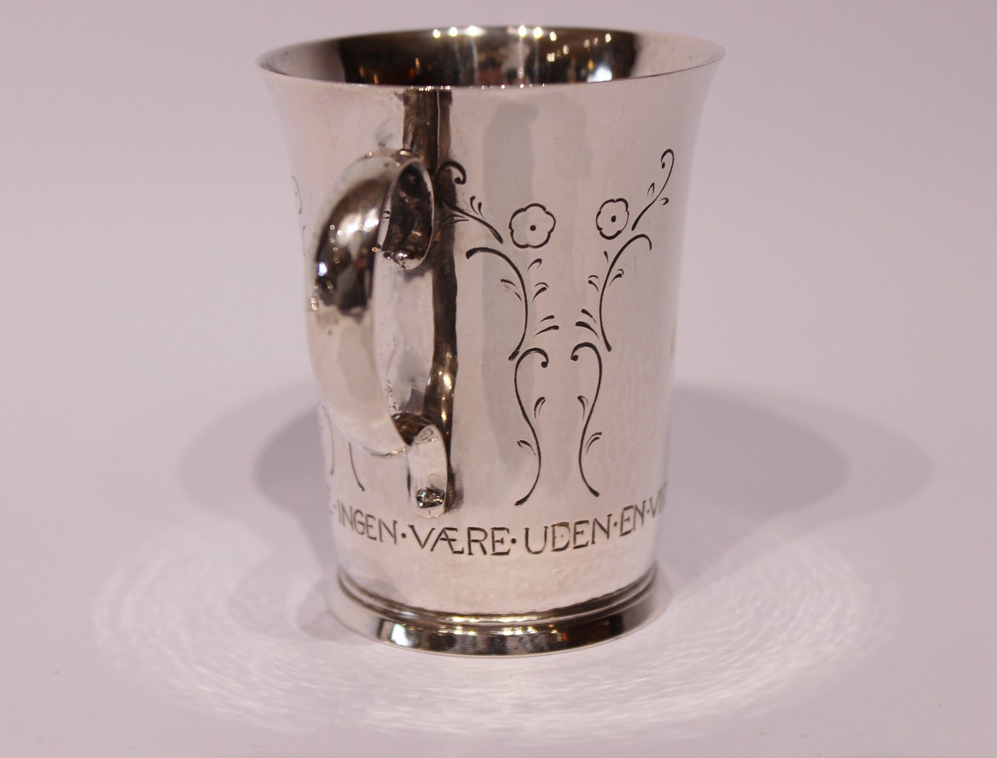 Child's cup with words from "The Princess on the pea" from 1929 and in hallmarked silver, stamped EN by Evald Nielsen.