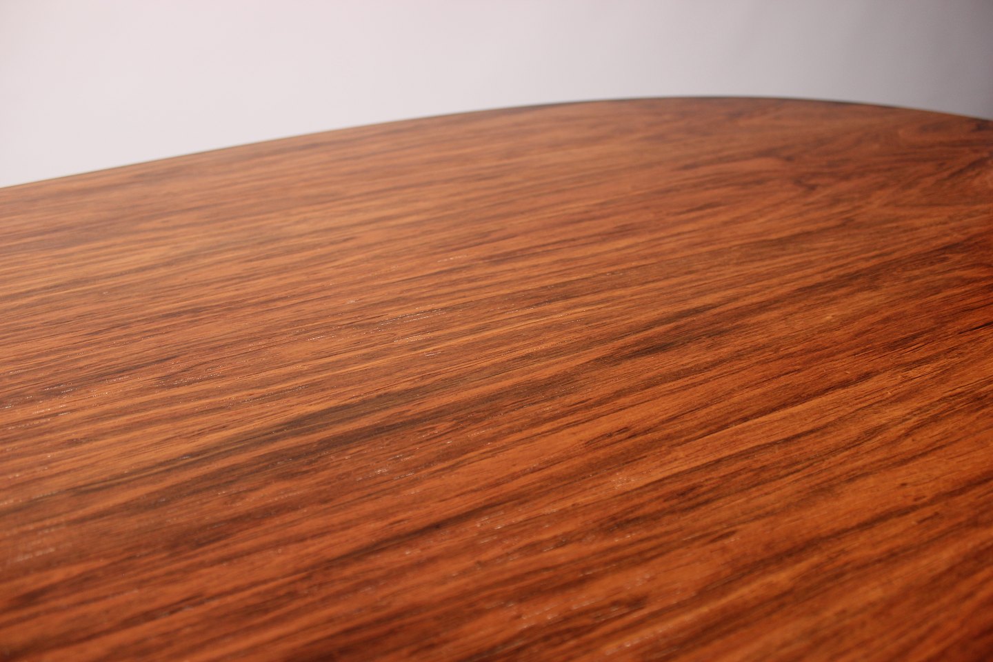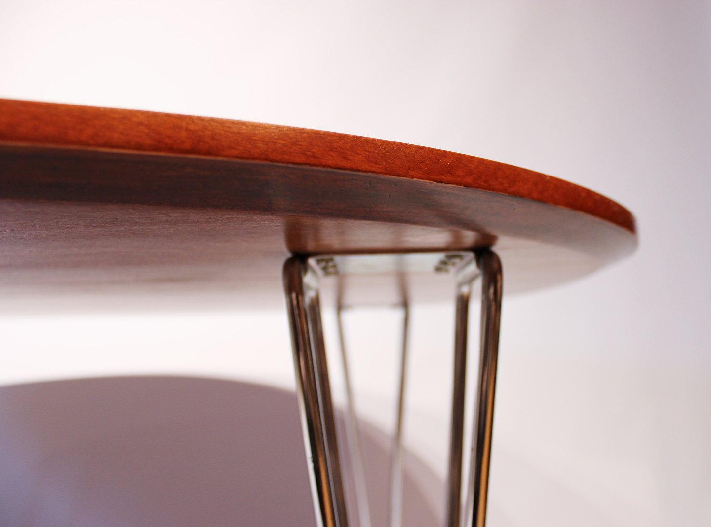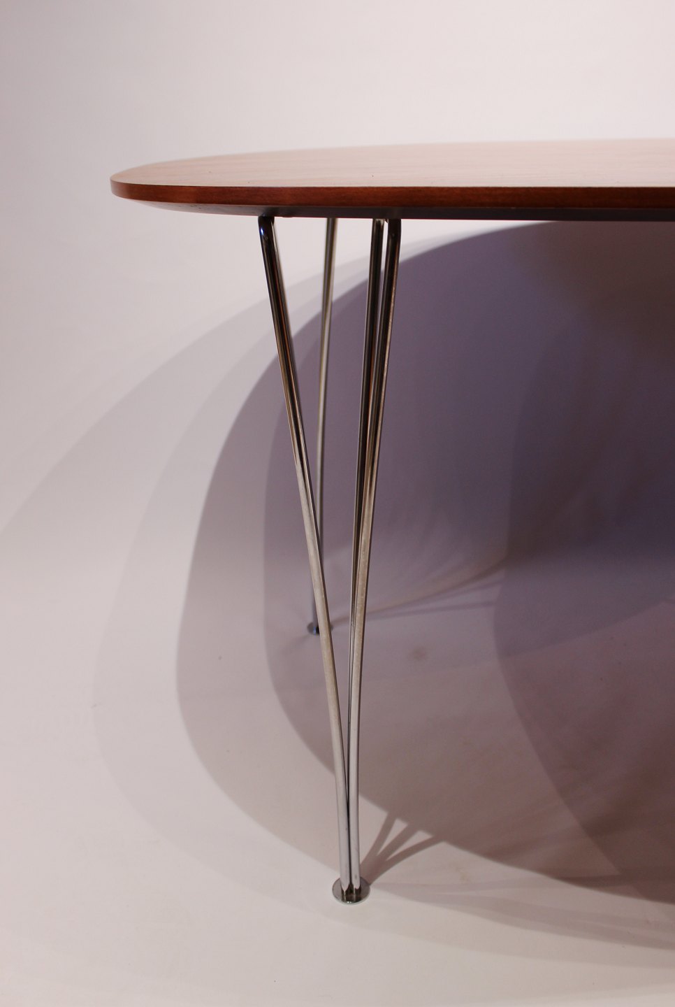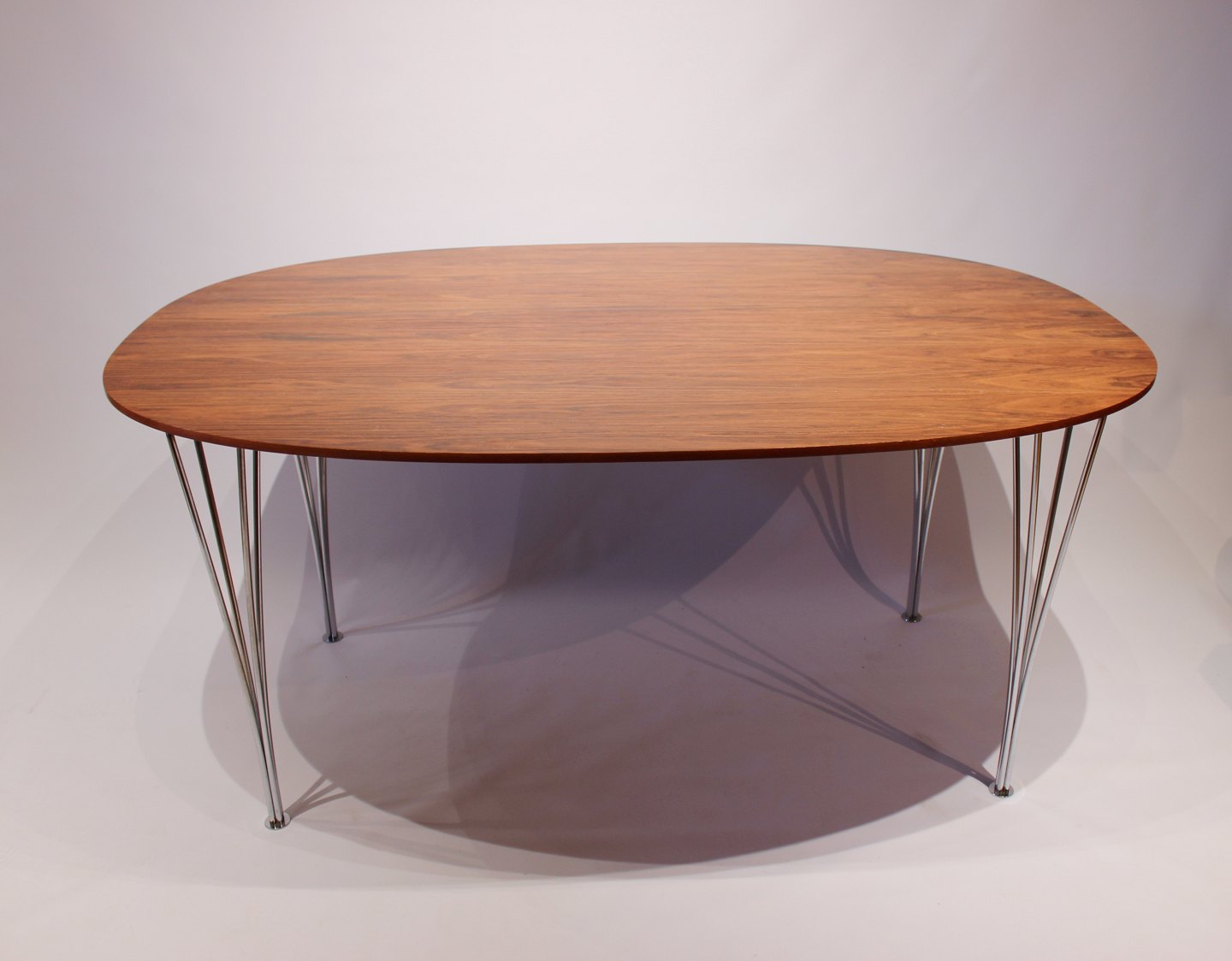 SoldSuper Ellipse table in rosewood designed by Piet Hein, Arne Jacobsen and Bruno Mathsson in 1968 and manufactured by Fritz Hansen in 1983. The table is in great vintage condition and with legs of chrome.