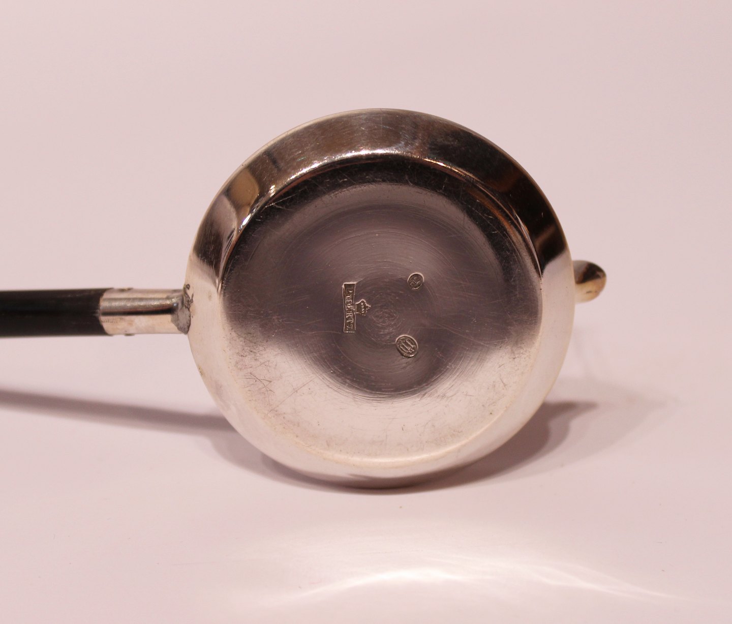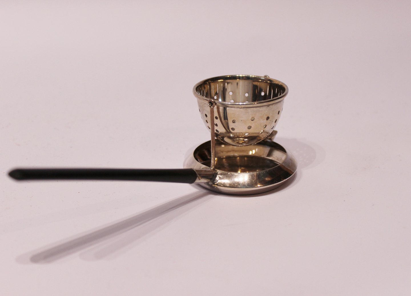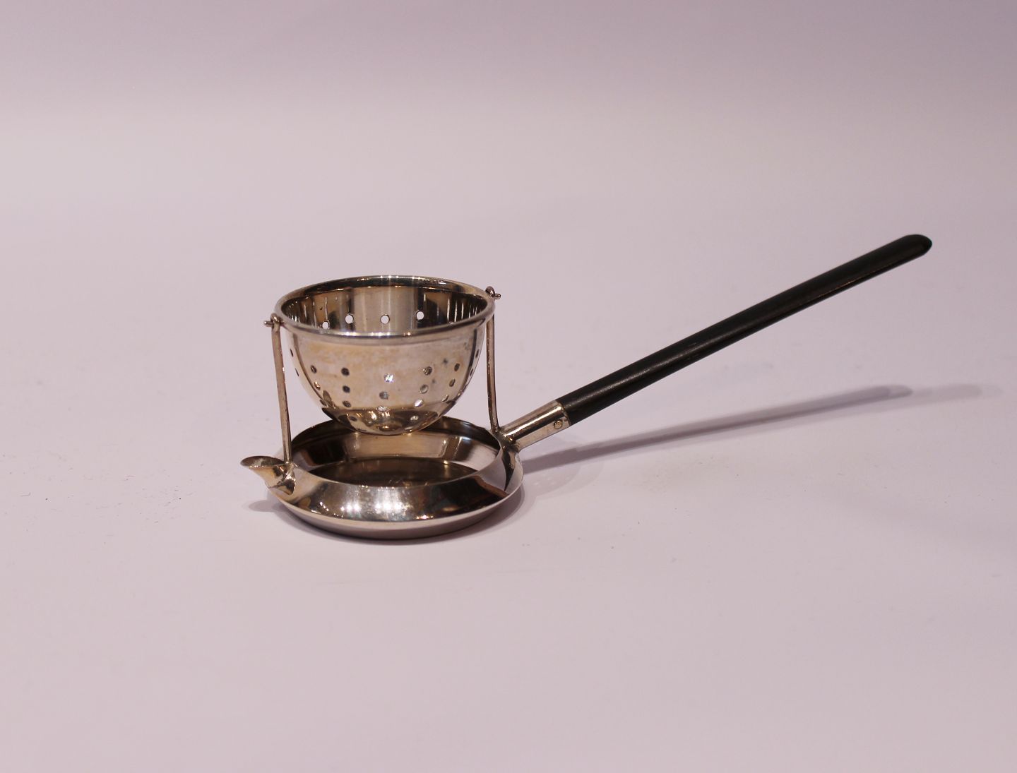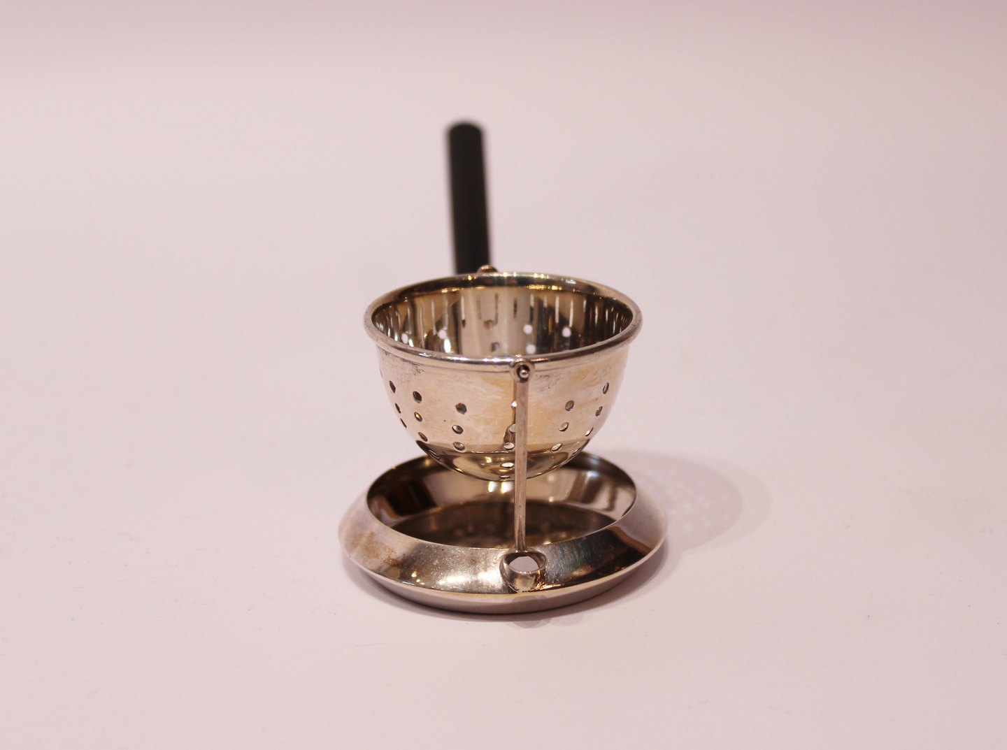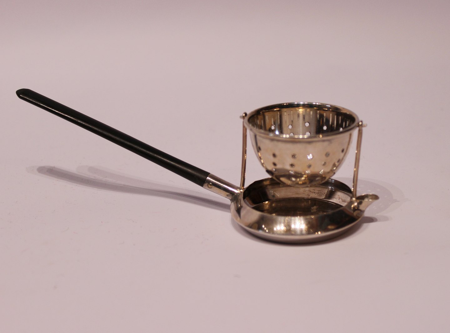 Tea strainer in hallmarked silver with ebony handle by P. Hertz.